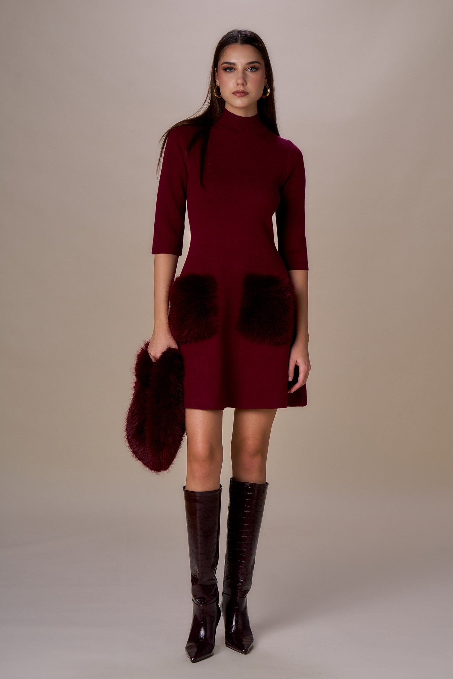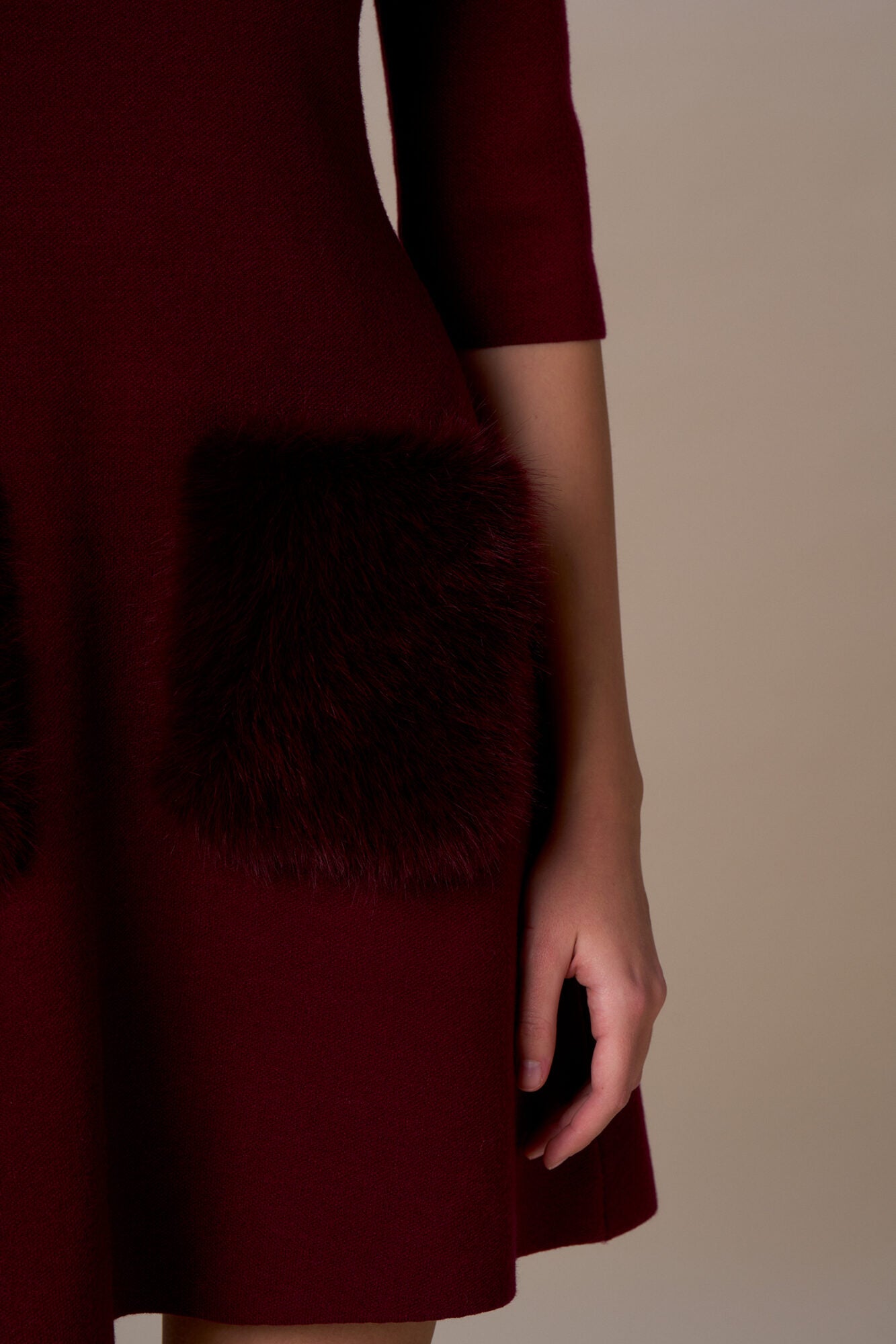 Abito in maglia, manica tre quarti, mezzo collo, gonna svasata e dettaglio tasche pelo.