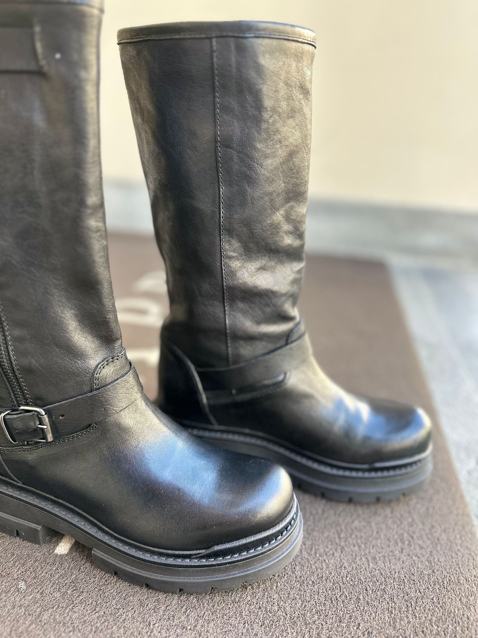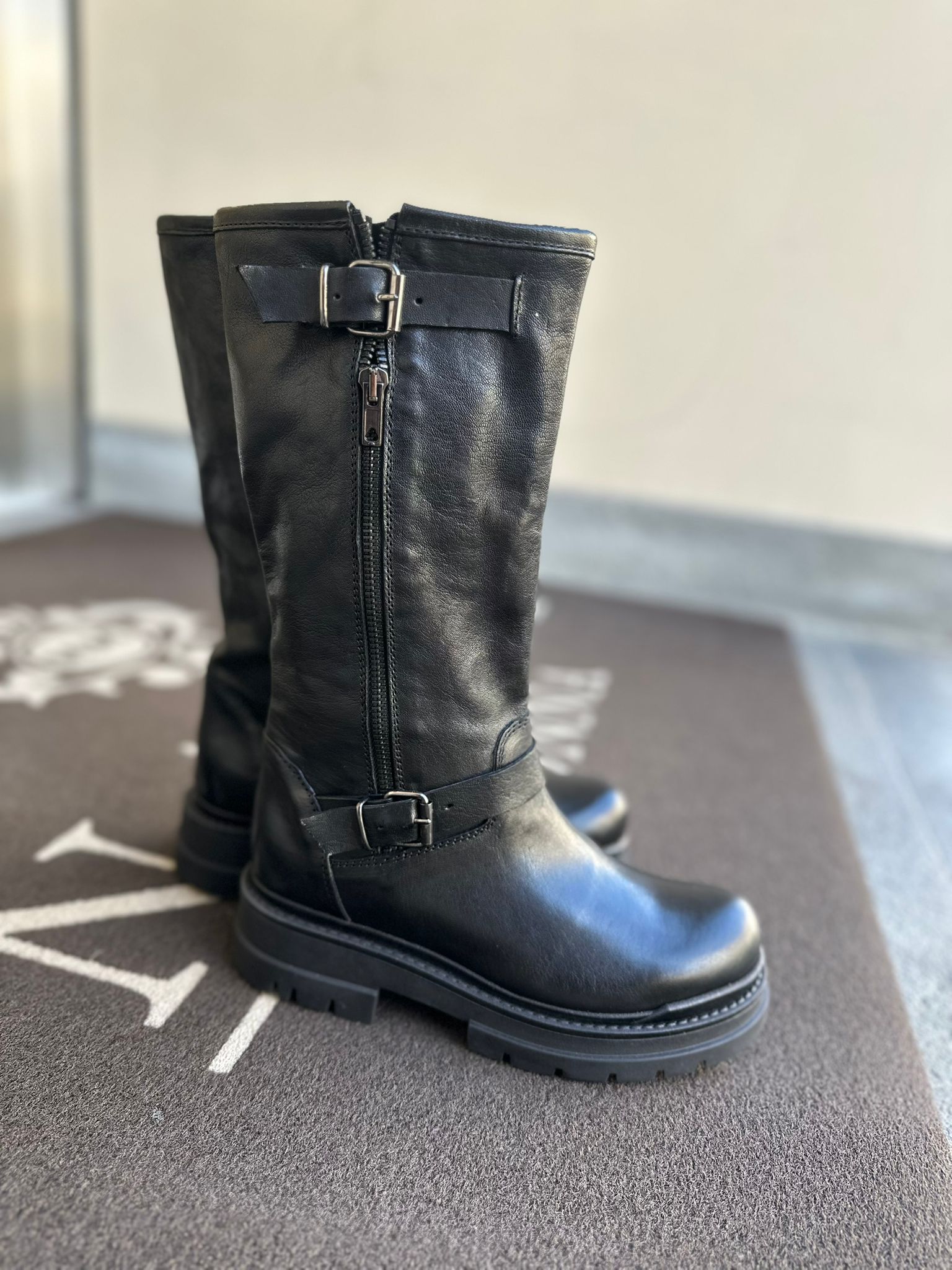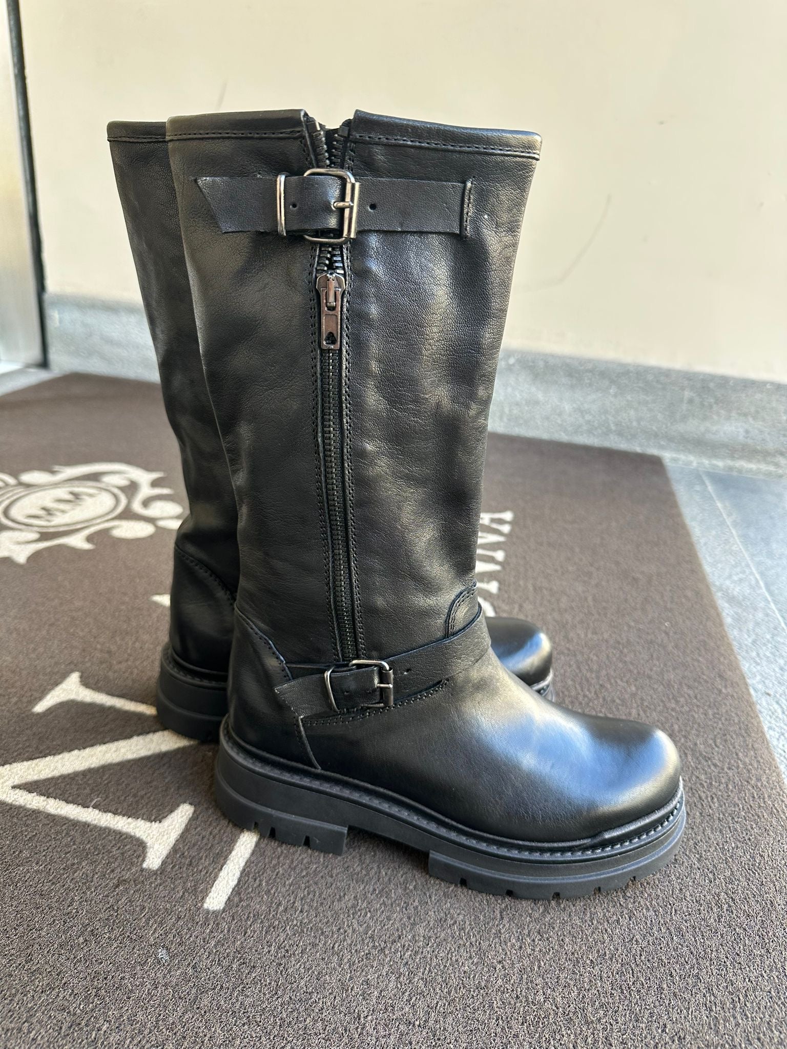Stivale biker nero in vera pelle, con zip laterale e doppia fibbia, fondo in gomma nero.
