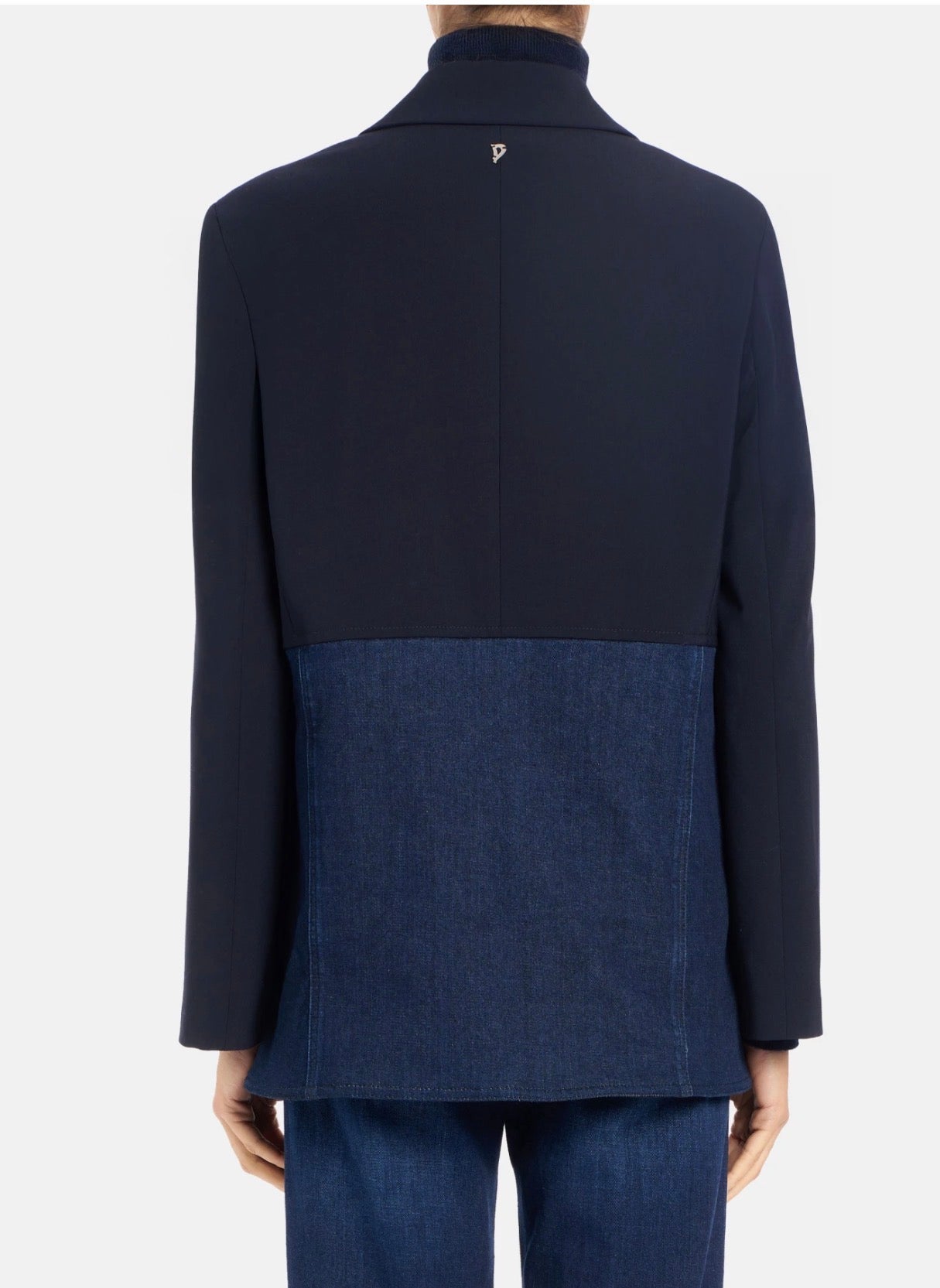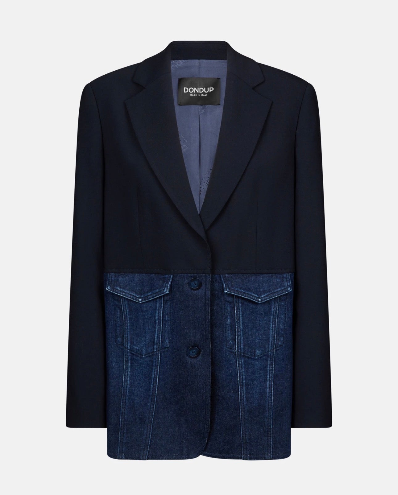 BLAZER MONOPETTO OVER A TRE BOTTONI, CON TASCHE CON PATTINA INSERITE SUL TAGLIO ORIZZONTALE. DENIM E TELA DI LANA BISTRETCH. LOGO DONDUP. MADE IN ITALY2% COTONE 6% ELASTOMULTIESTERE 2% ELASTAN