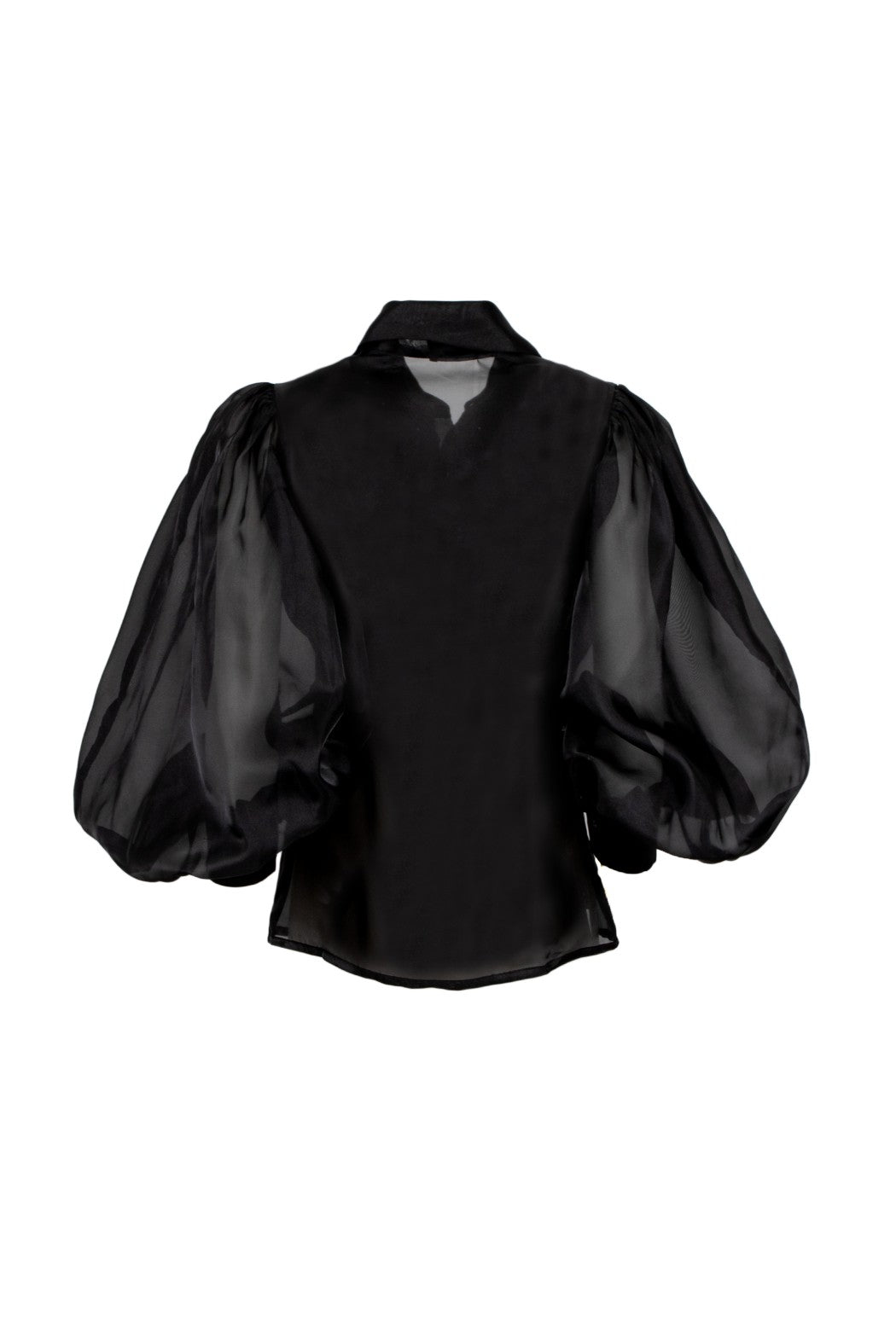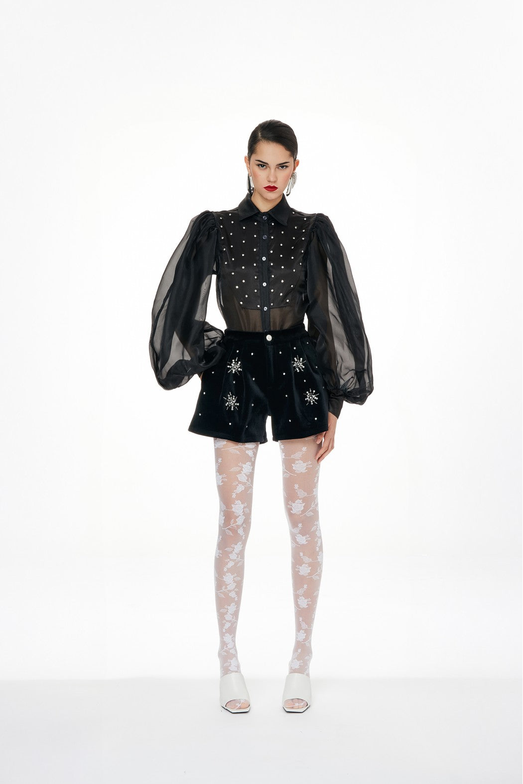 Camicia in organza con maniche a sbuffo. Presenta un corpetto in raso con applicazioni di strass e chiusura frontale con bottoni.