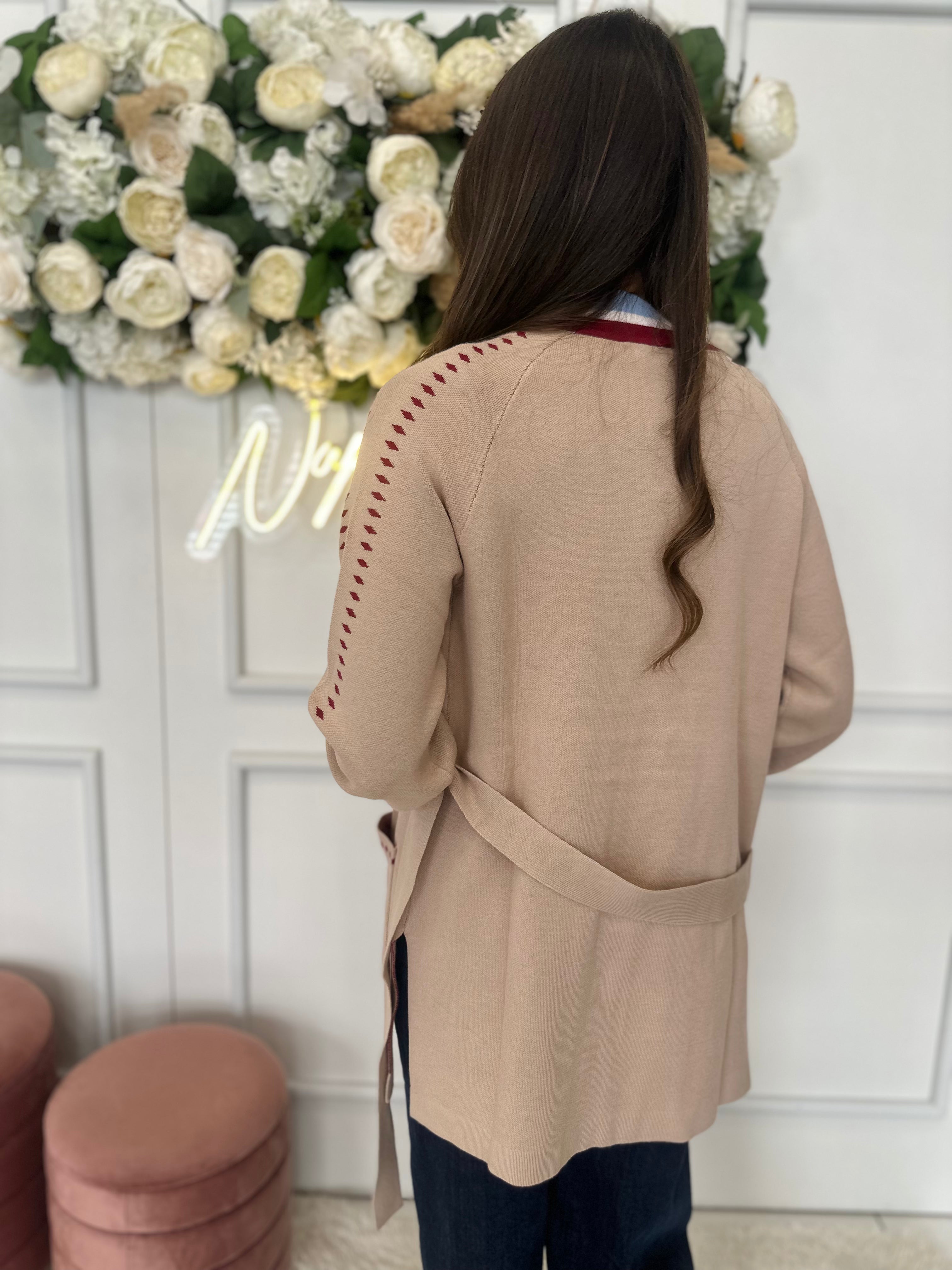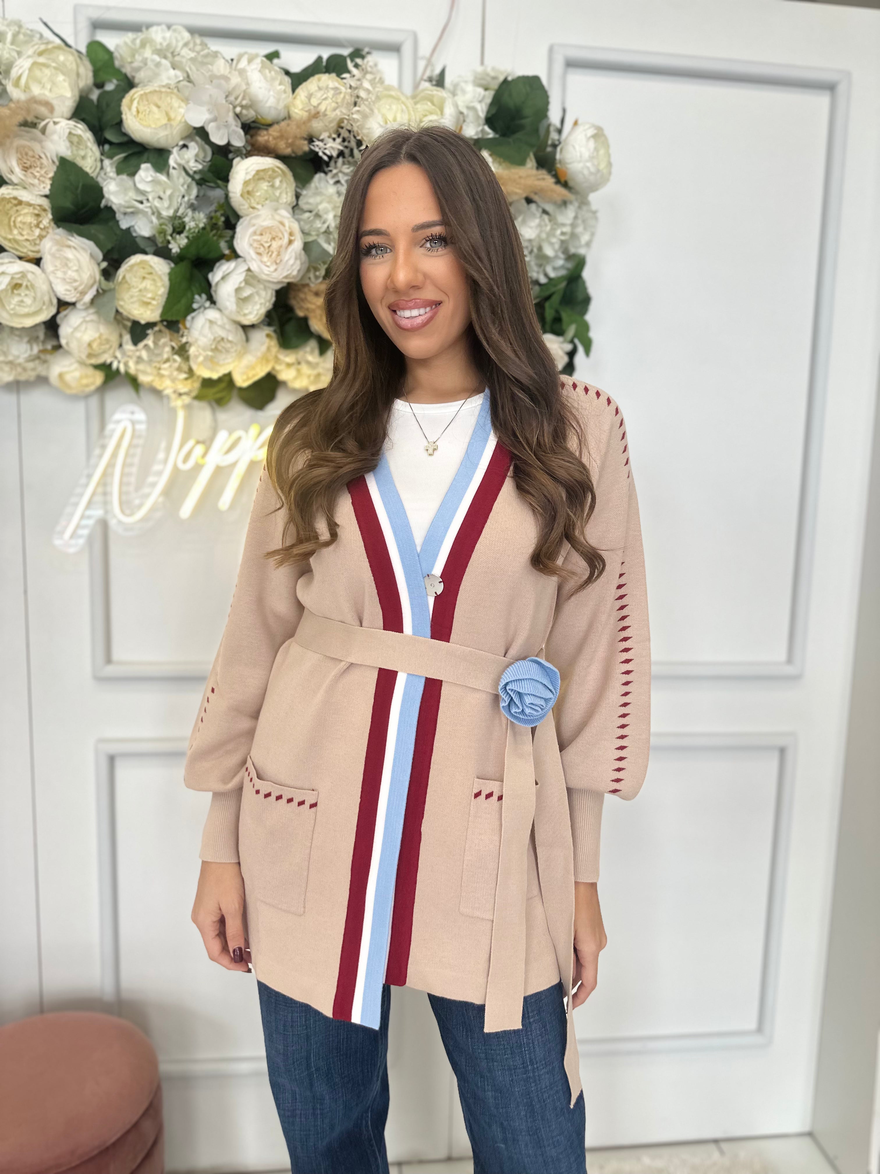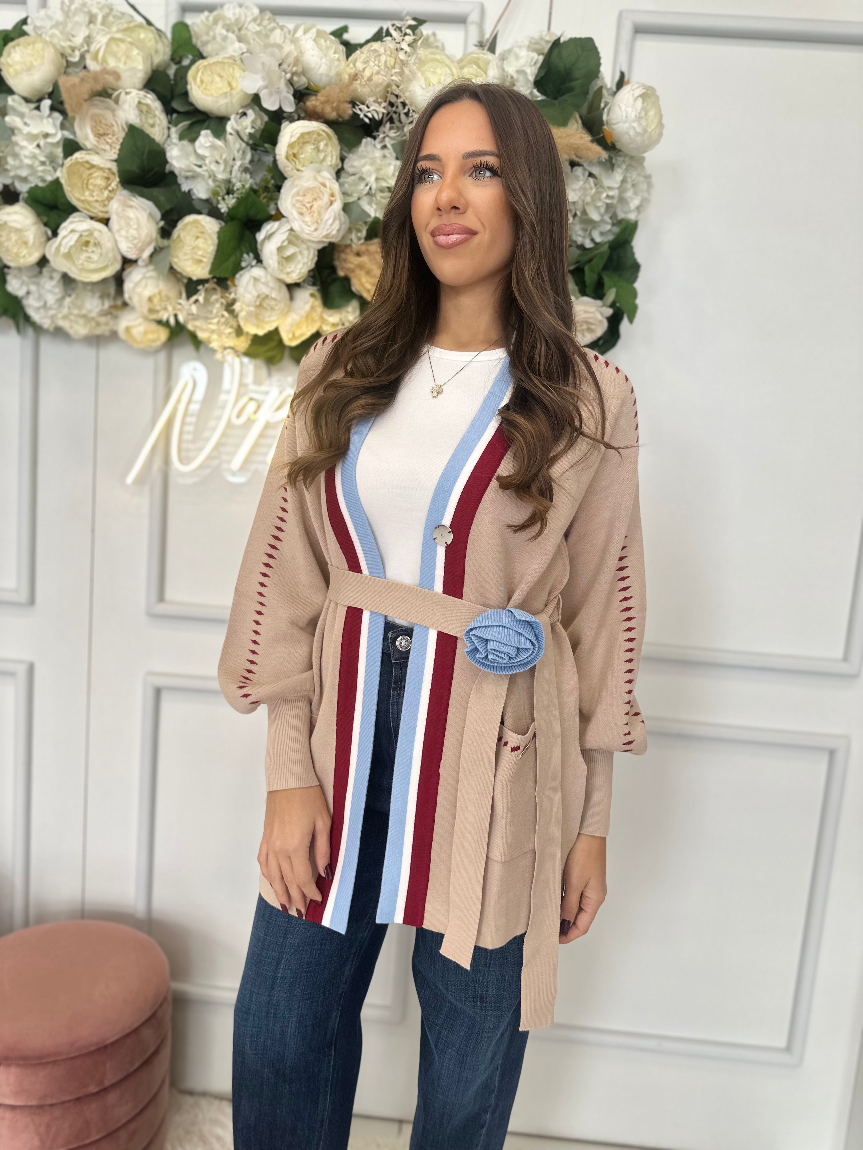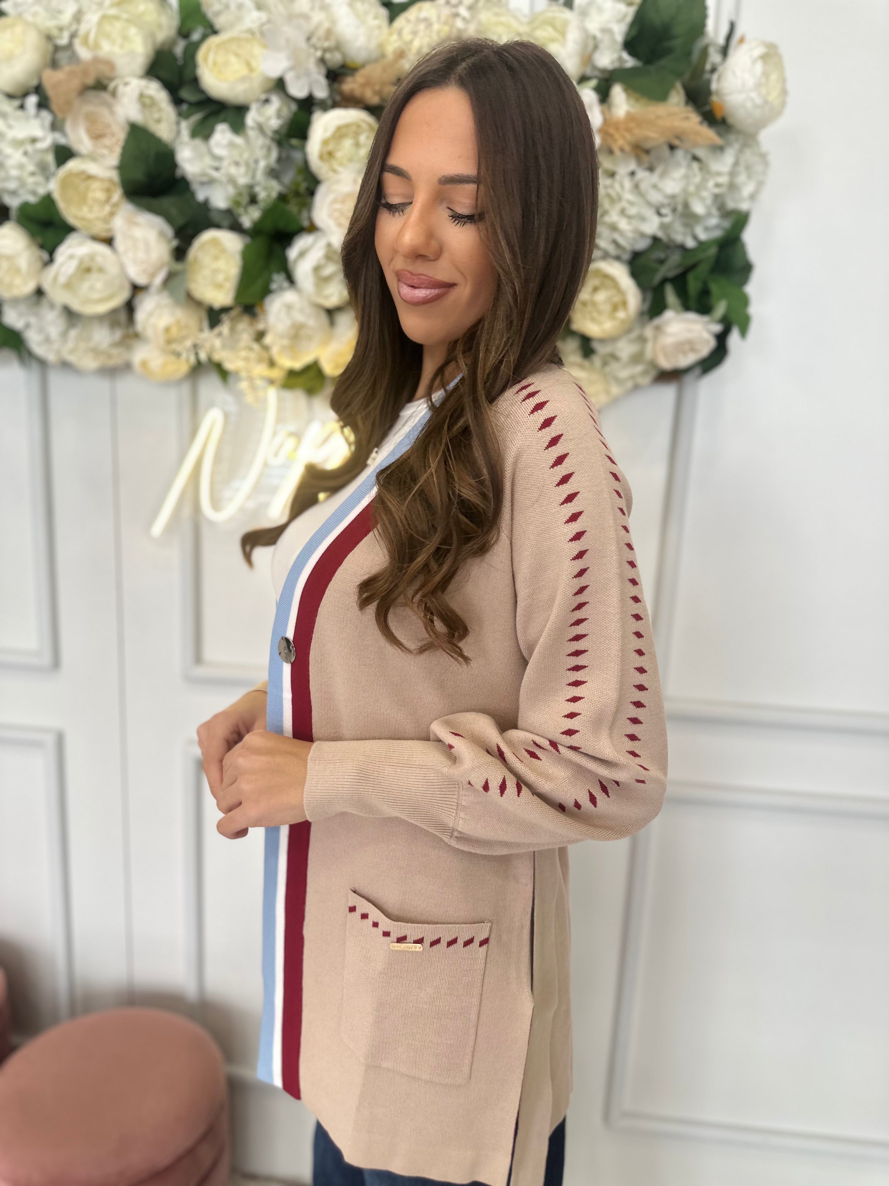 Cardigan beige, con righe a contrasto bordeaux, bianco,azzurro.