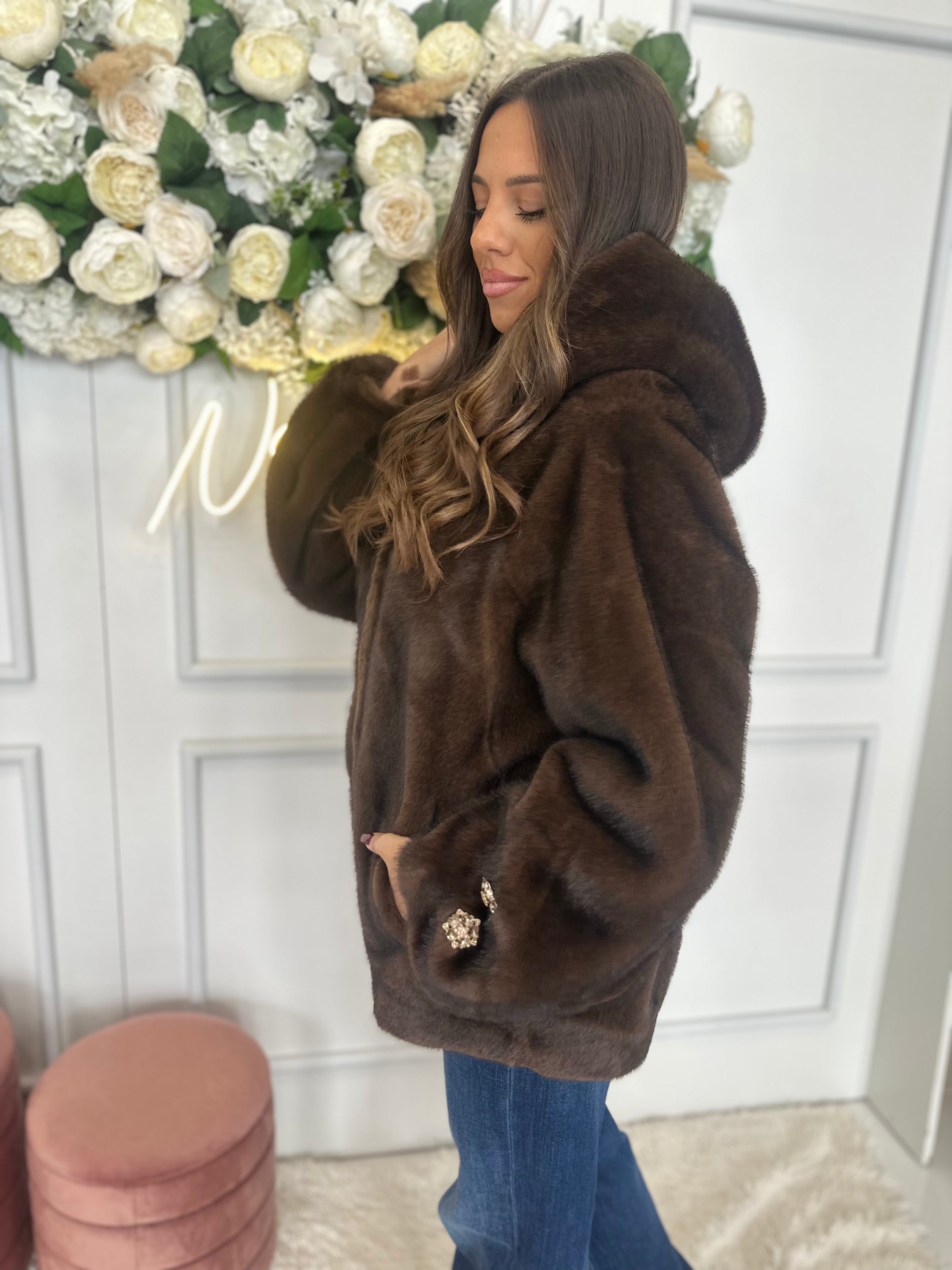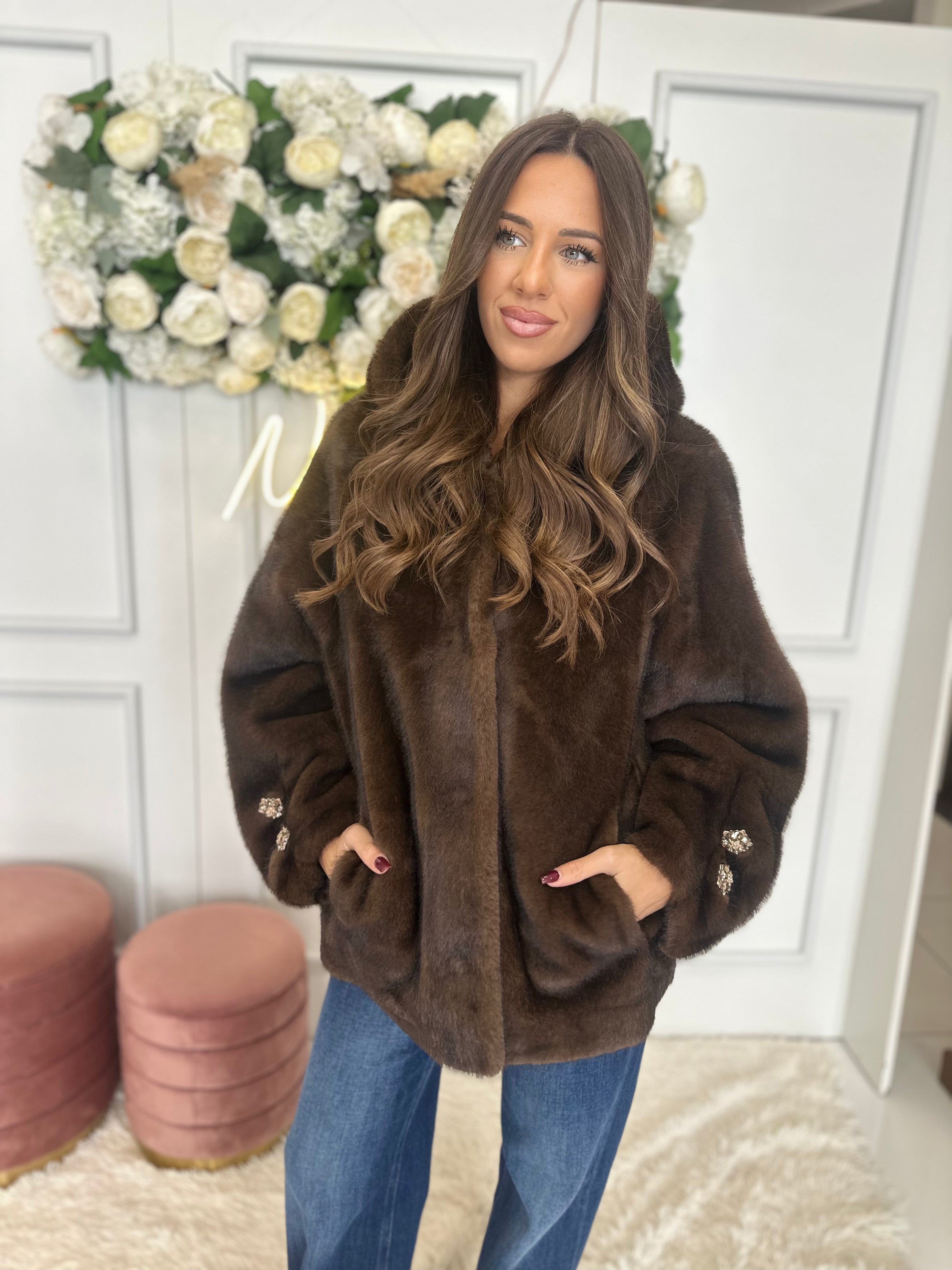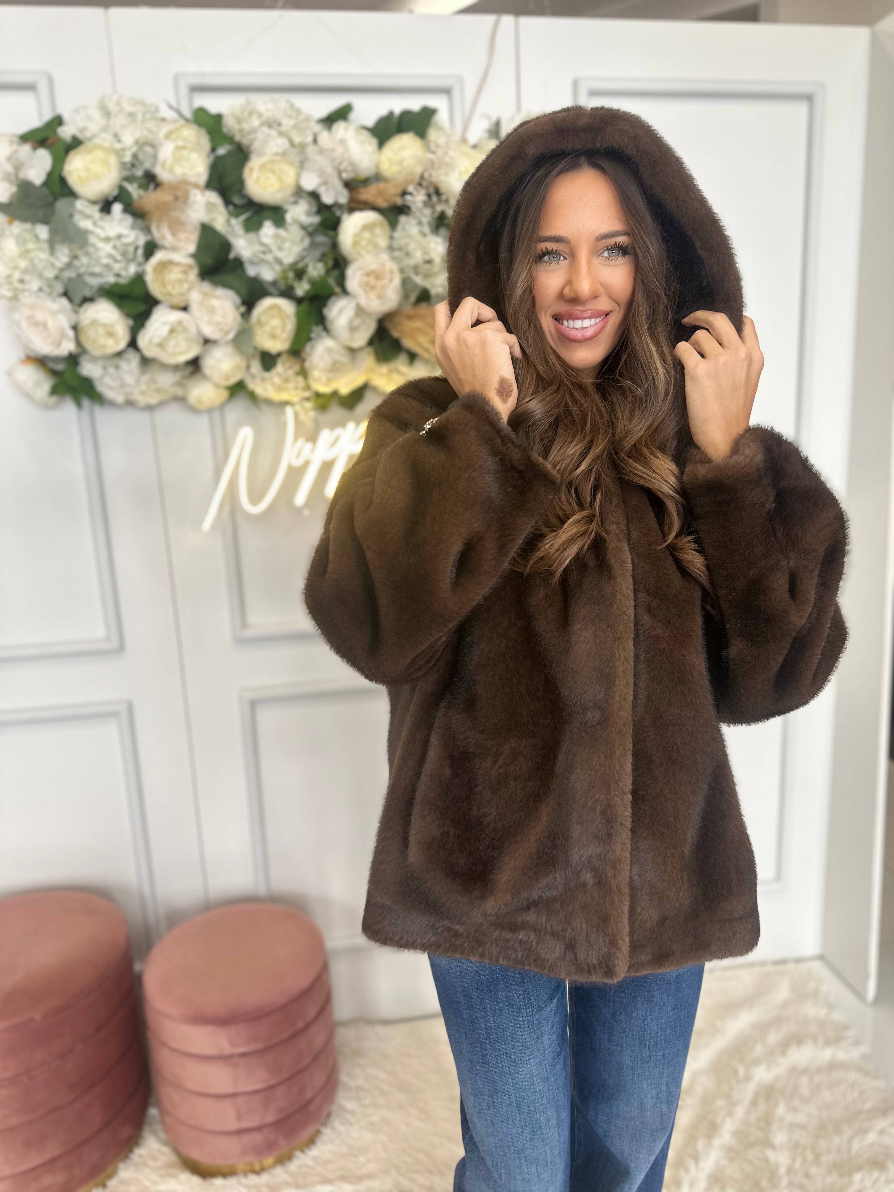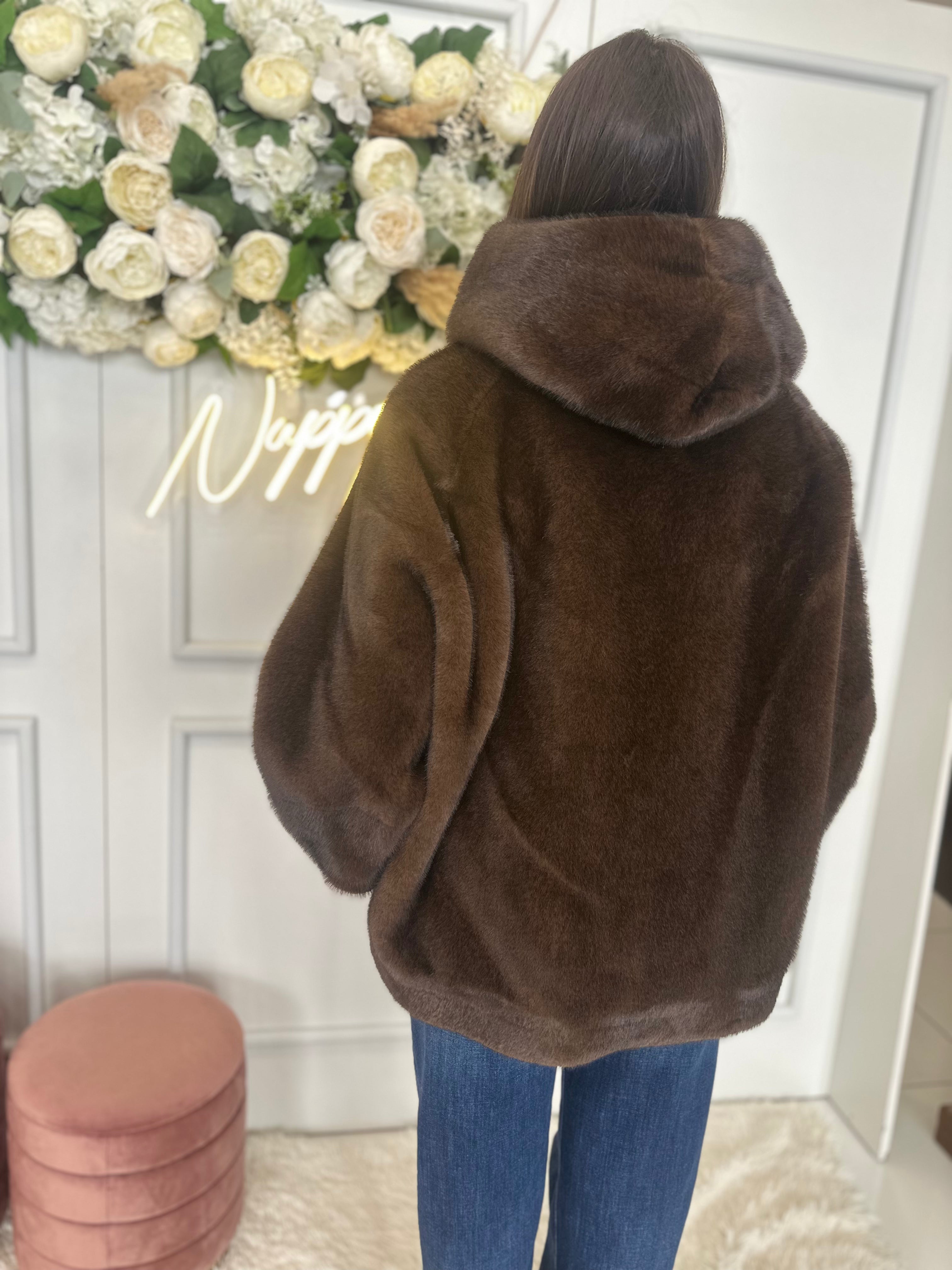 Giacca in ecopelliccia con cappuccio, tasche a filo, chiusura con ciappe nascoste, doppio bottone gioiello ai polsi. Vestibilità comoda. Il capo è taglia unica e veste fino ad una 46.