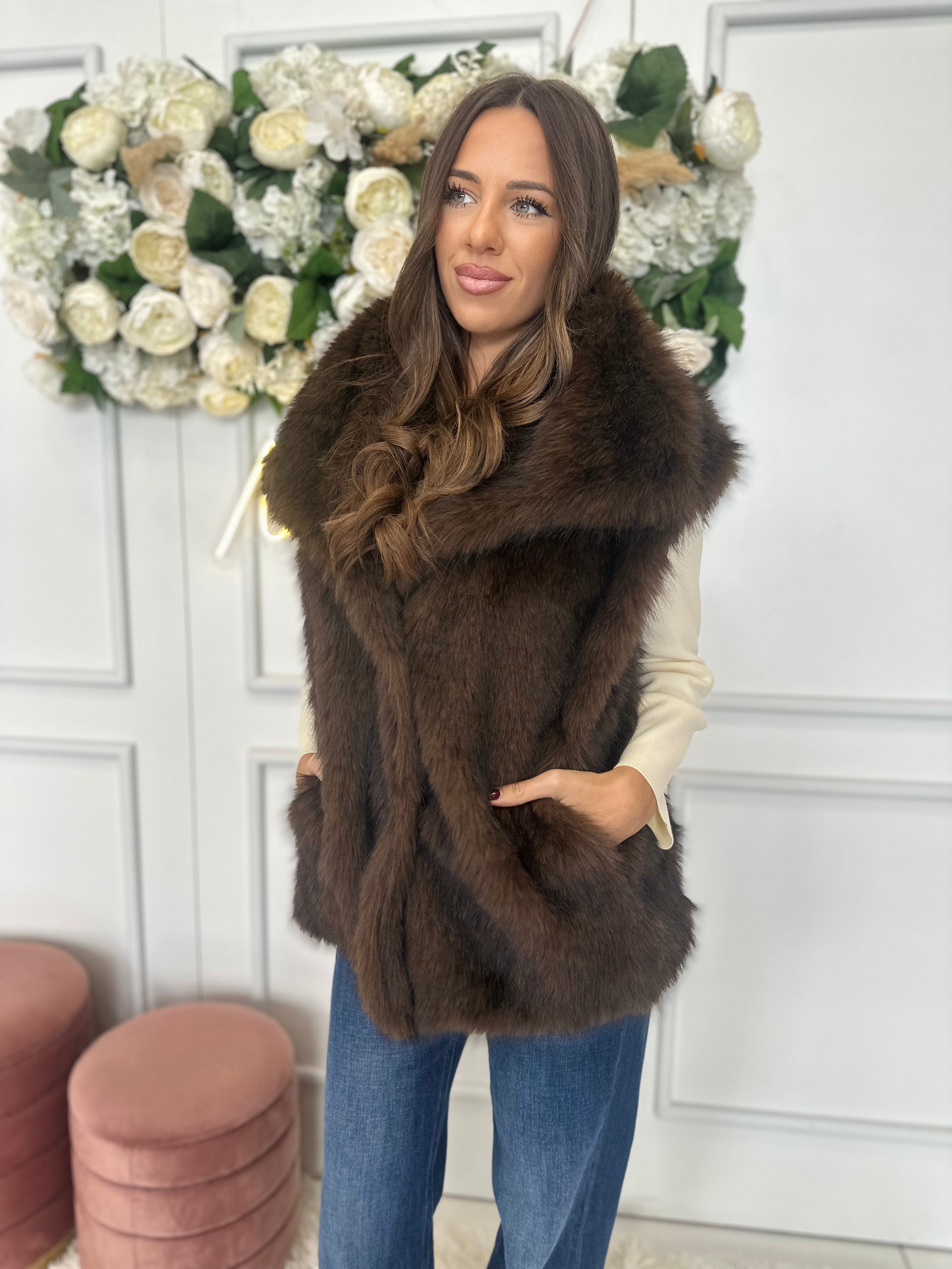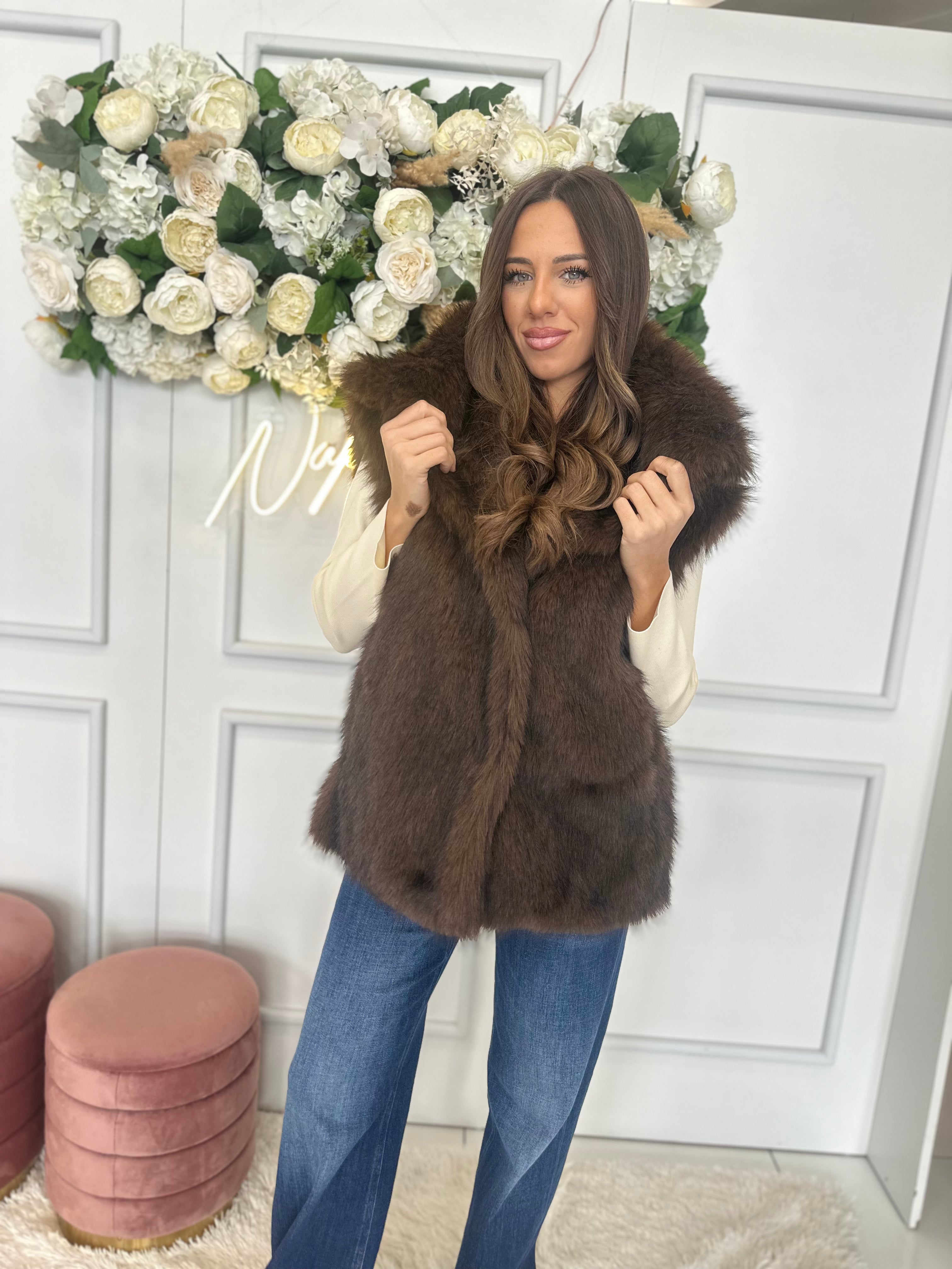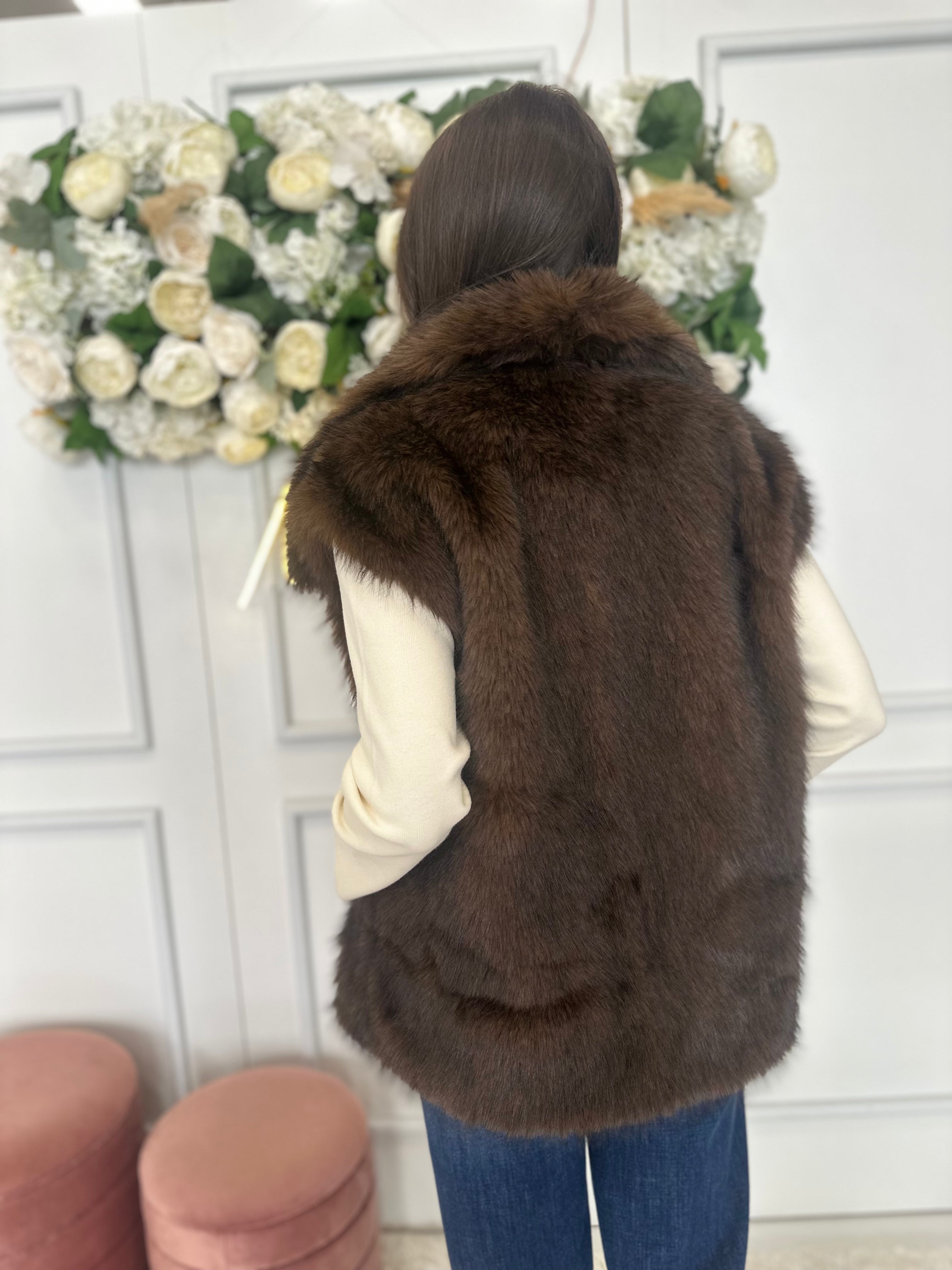 Giacca in ecopelliccia smanicata con cappuccio, petto a lancia ampio,chiusura con ciappe nascoste e tasche a filo.