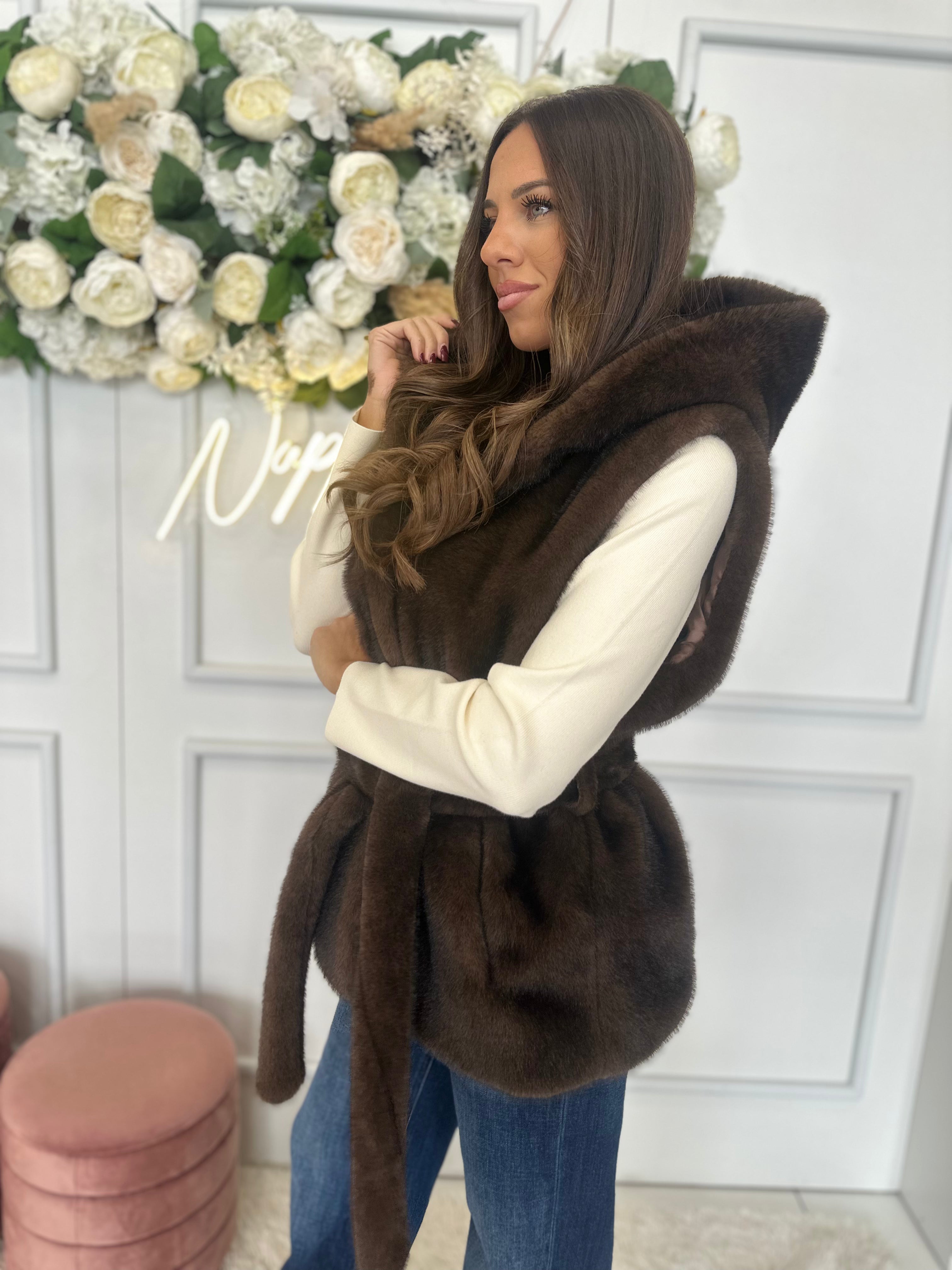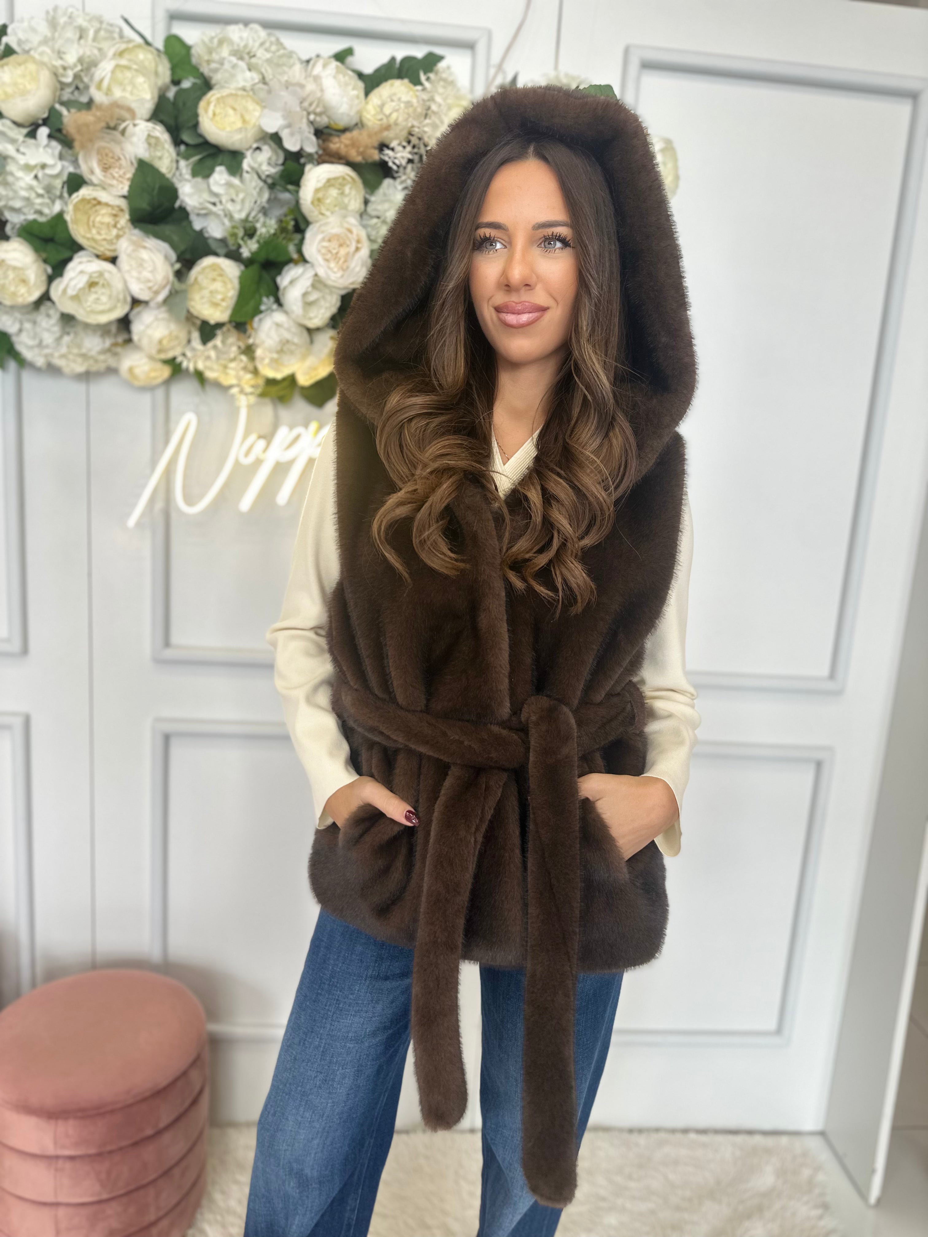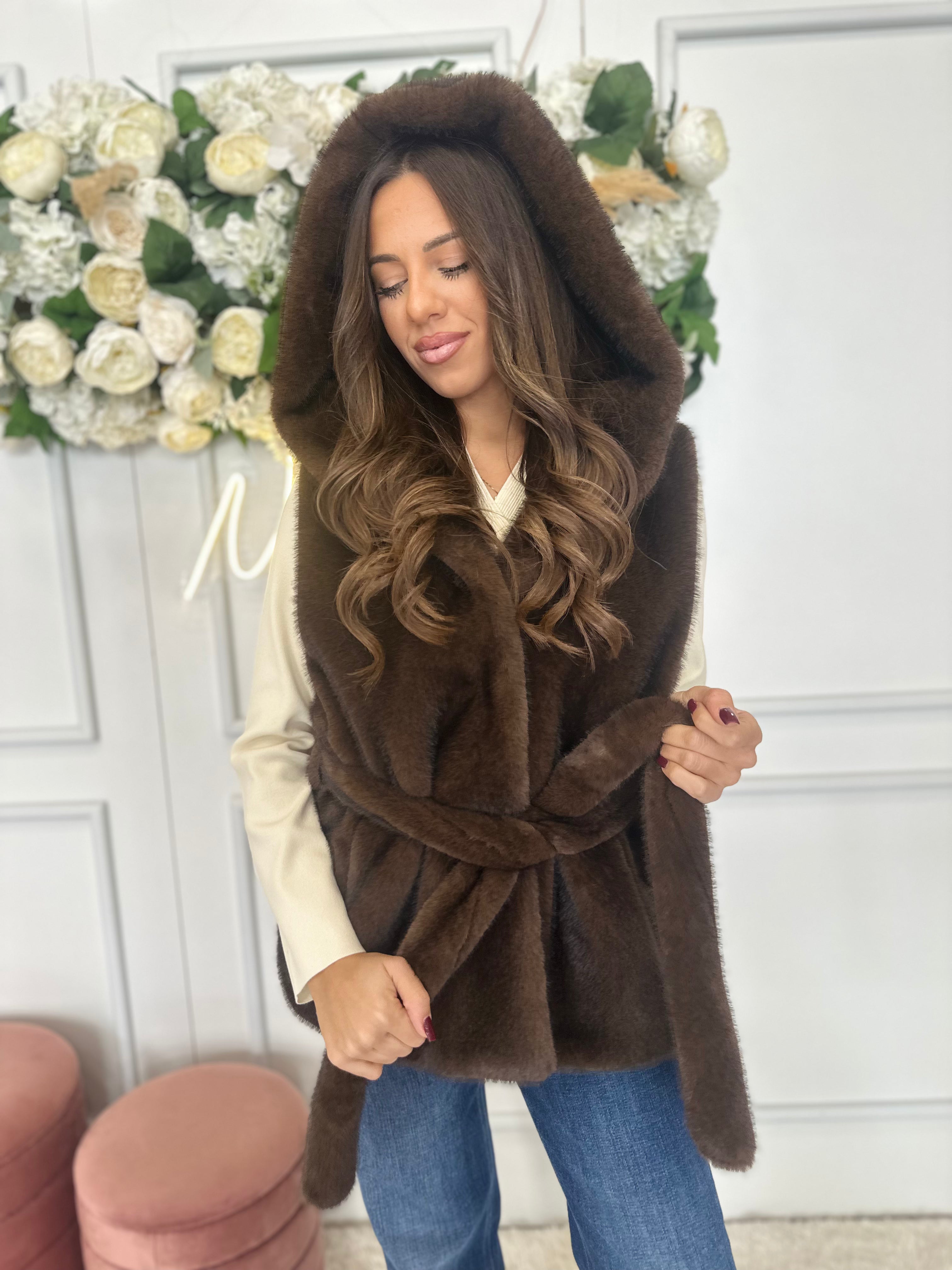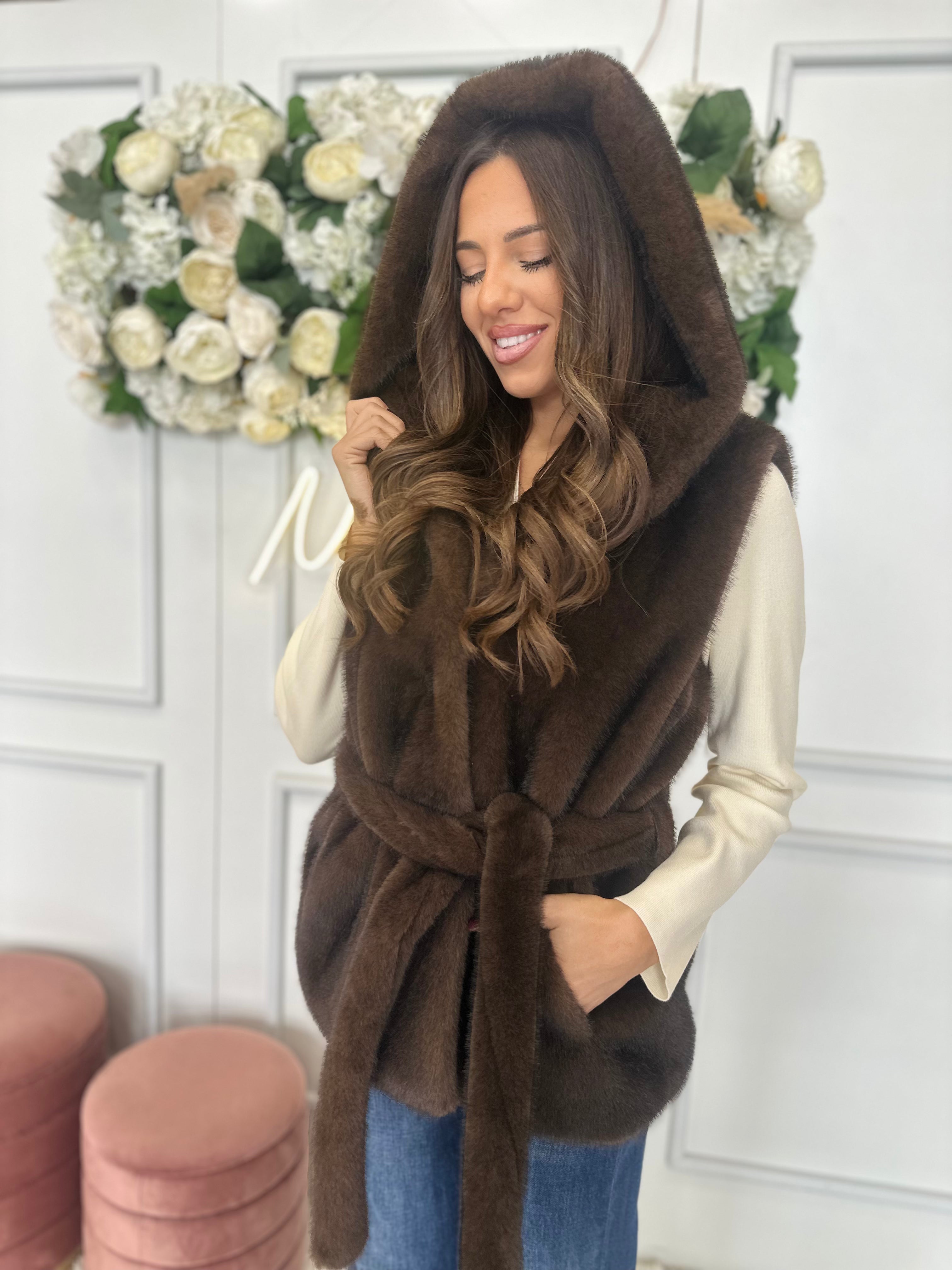 Giacca in ecopelliccia smanicata con cappuccio, chiusura con ciappe nascoste. Cintura in vita e tasche a filo.