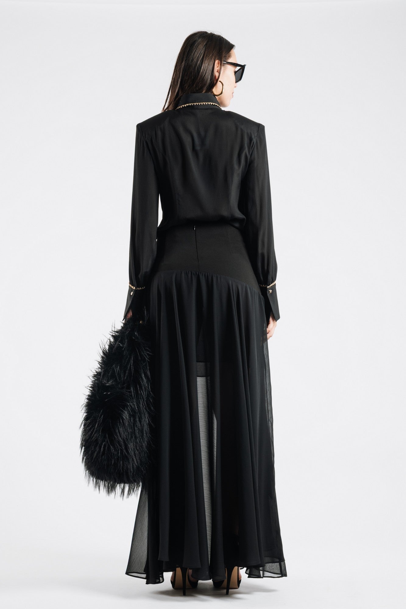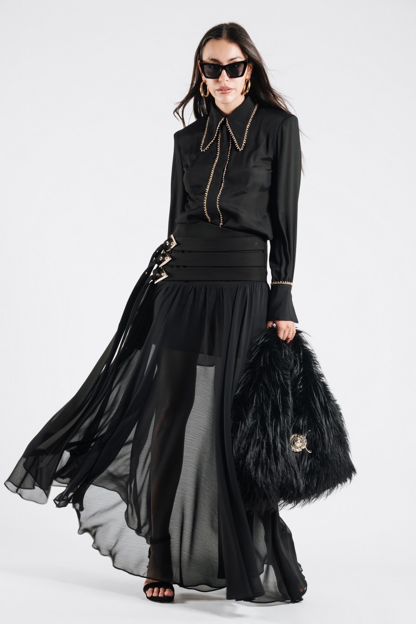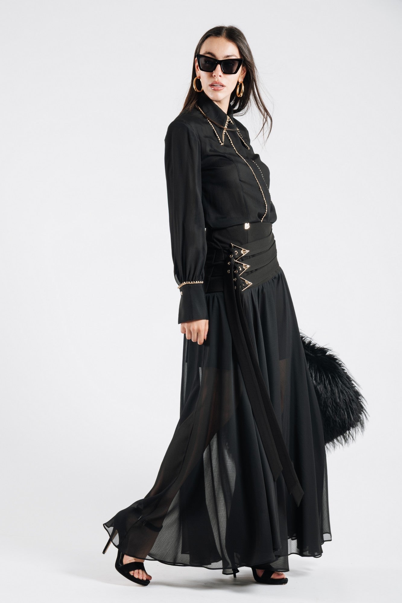 Gonna lunga nera, semi trasparente con motivo fibbie sul bustino e lacci pendenti.