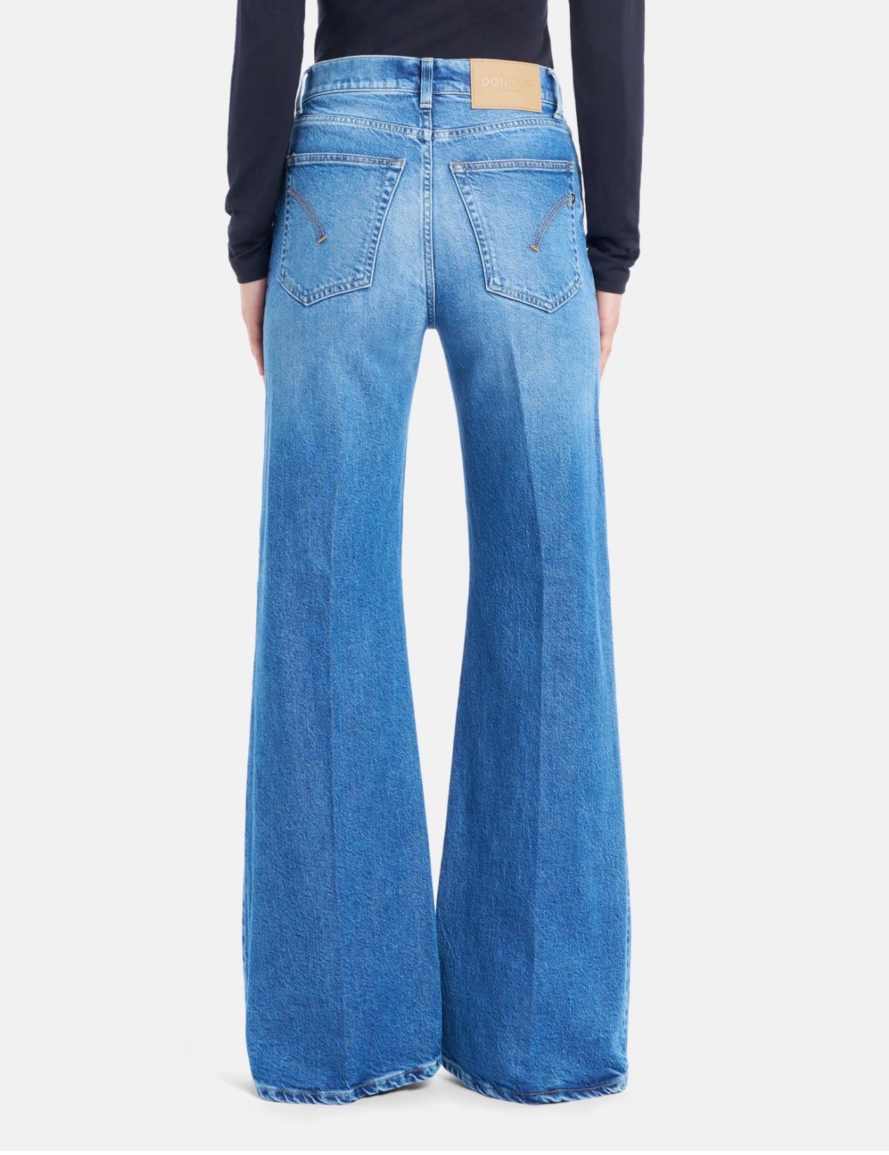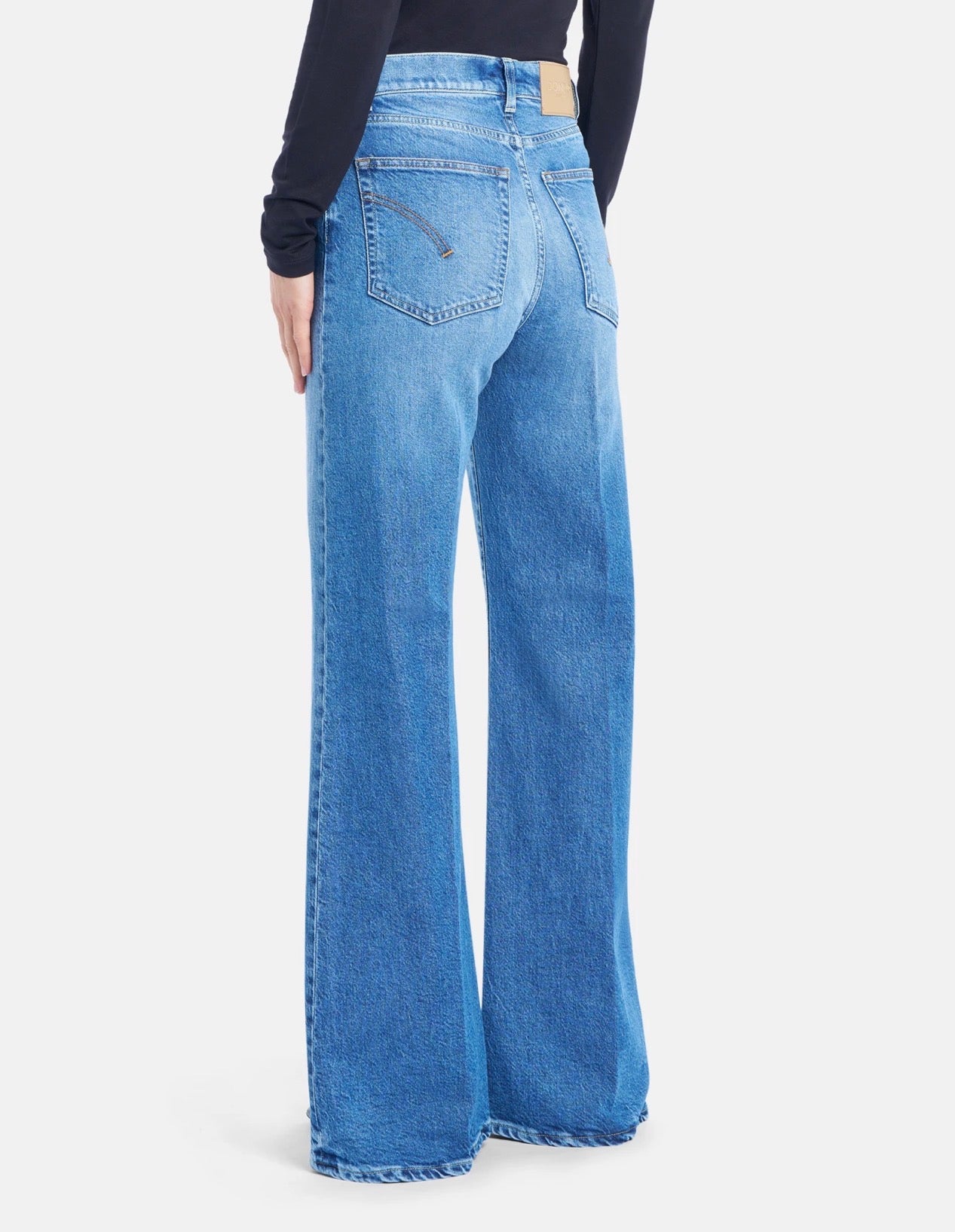 JEANS AMBER CINQUE TASCHE WIDE LEG FIT, VITA REGOLARE, GAMBA AMPIA. DENIM STRETCH BLU 14 OZ. LAVAGGIO CHIARO PULITO. LOGO DONDUP. MADE IN ITALY