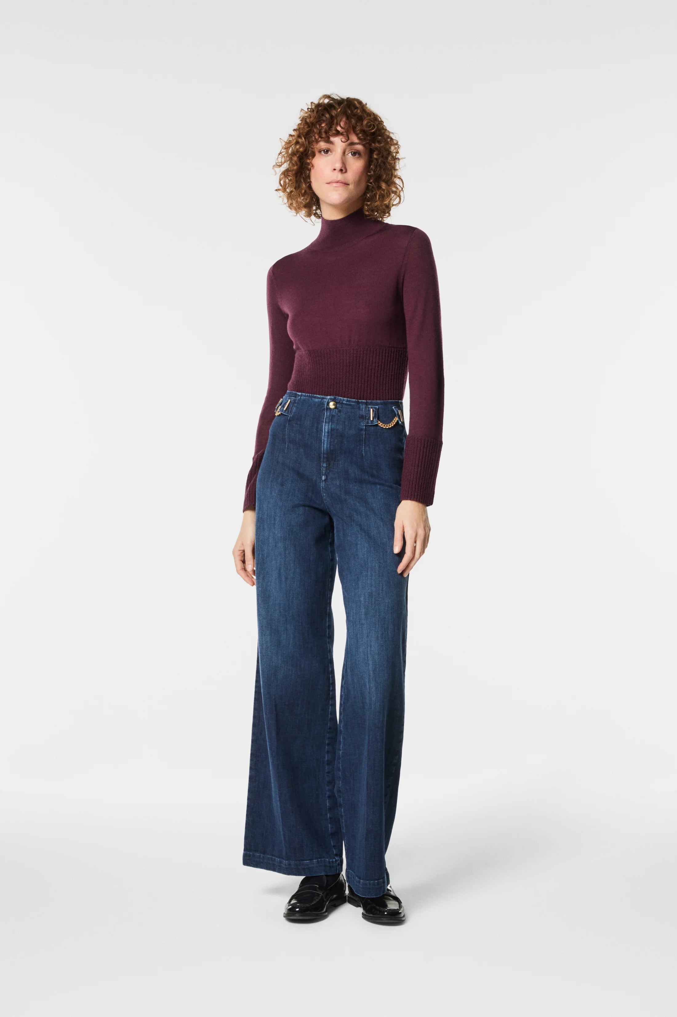 Pantalone a gamba larga in denim comfort con catenelle oro applicate. Un dettaglio deciso che valorizza il design essenziale. Il tessuto elasticizzato assicura una vestibilità comoda e fluida. Vita alta e linea ampia valorizzano la silhouette, perfetto per un look moderno e disinvolto.