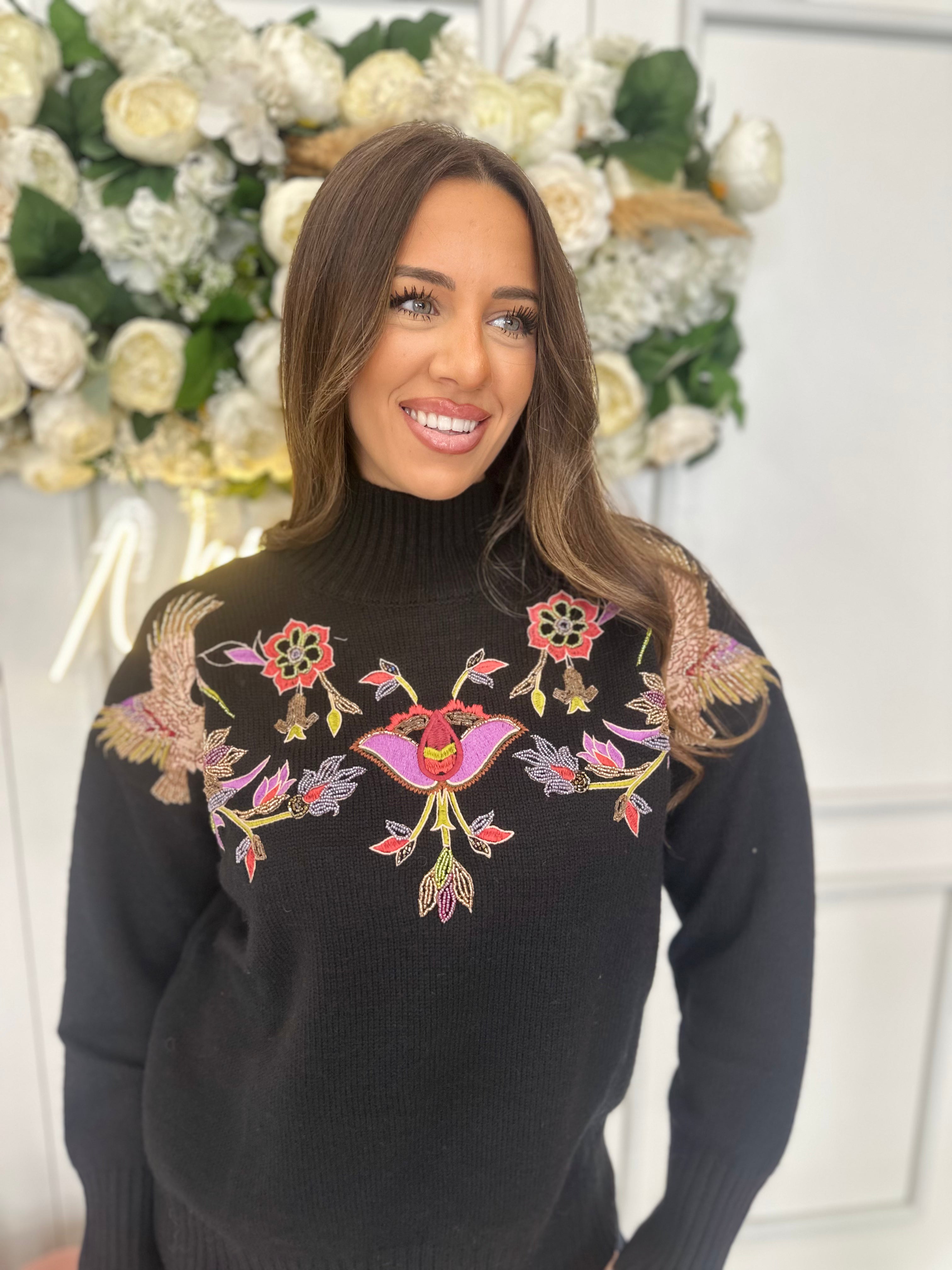 Maglia a collo alto con ricamo aironi: un dettaglio prezioso che trasforma un capo essenziale in un must-have di stile. Morbida, raffinata e versatile, dona un tocco esclusivo a ogni outfit.
