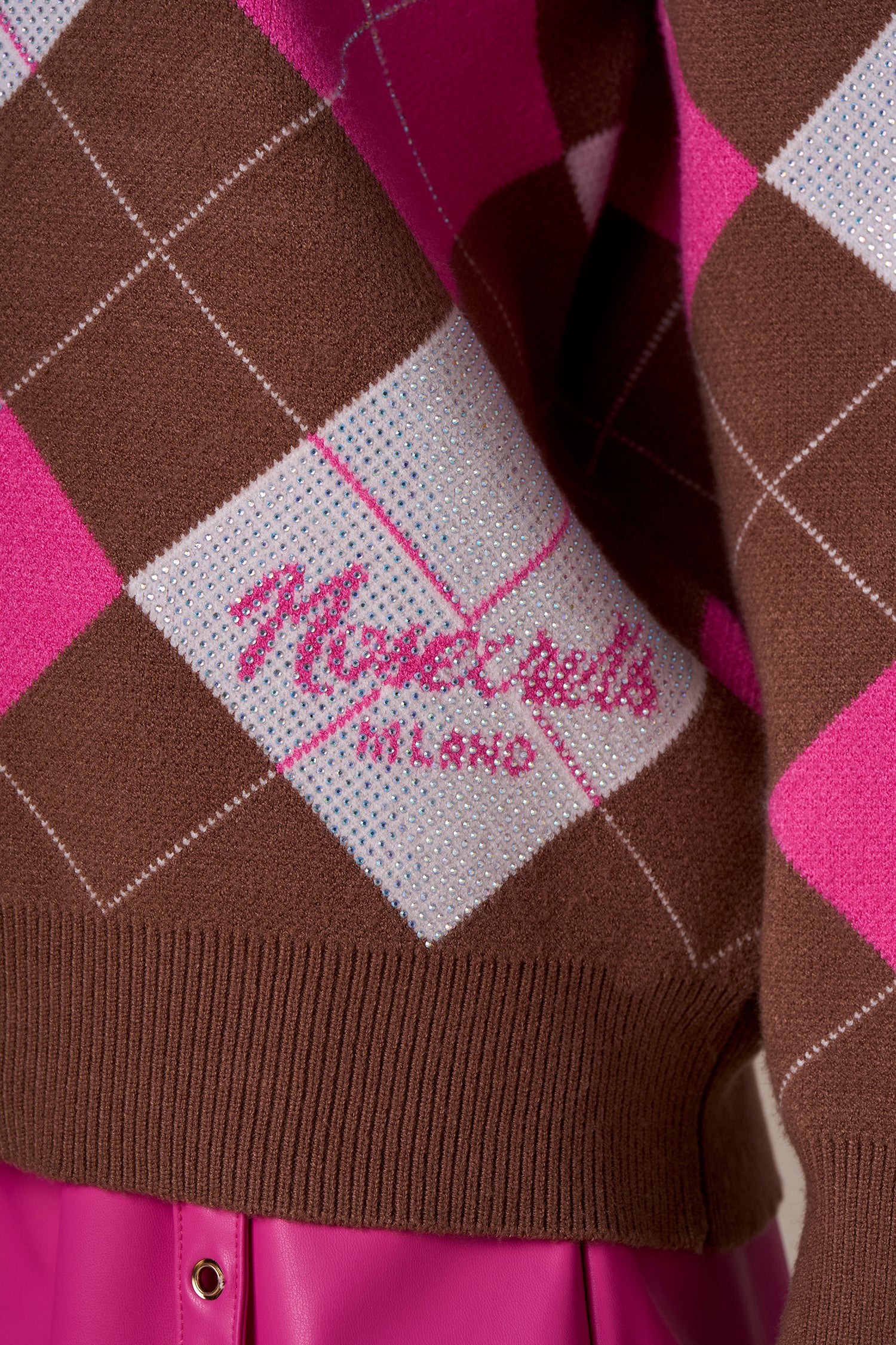 Maglione con fantasia rombi bianco\fucsia,arricchito da dettagli diamanti.