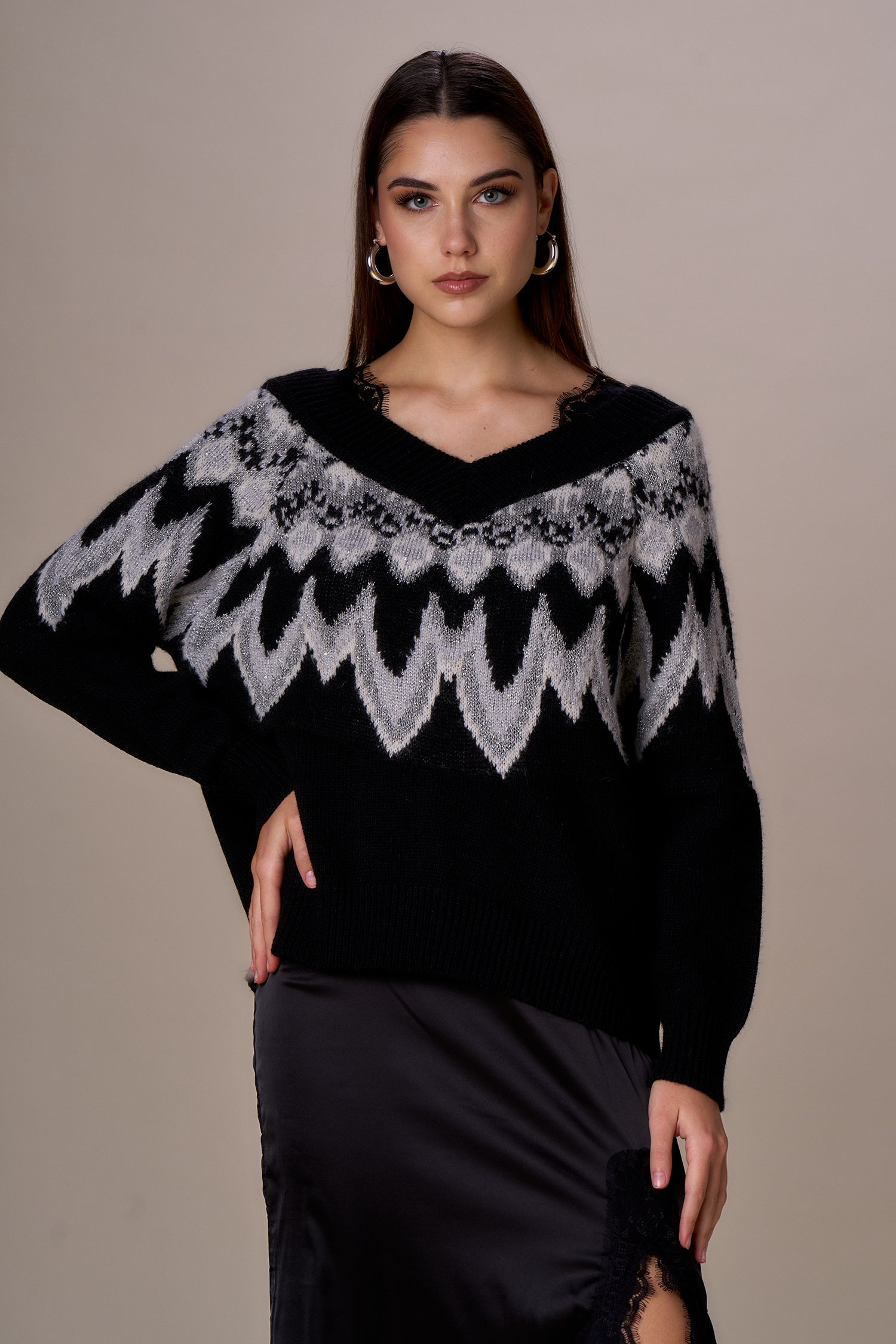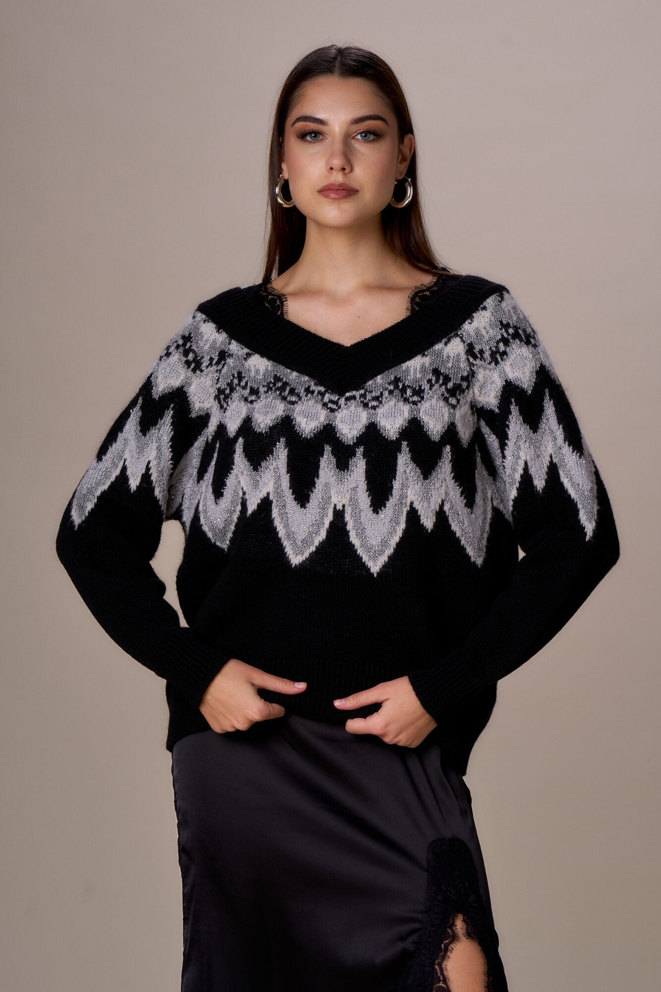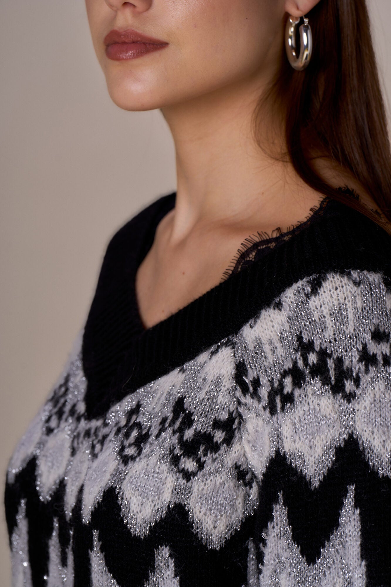 Maglione nero con dettagli in lurex argento, scollo a V ampio.