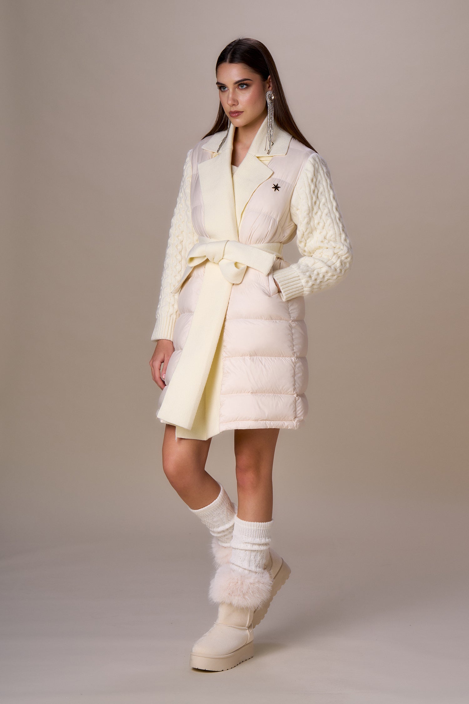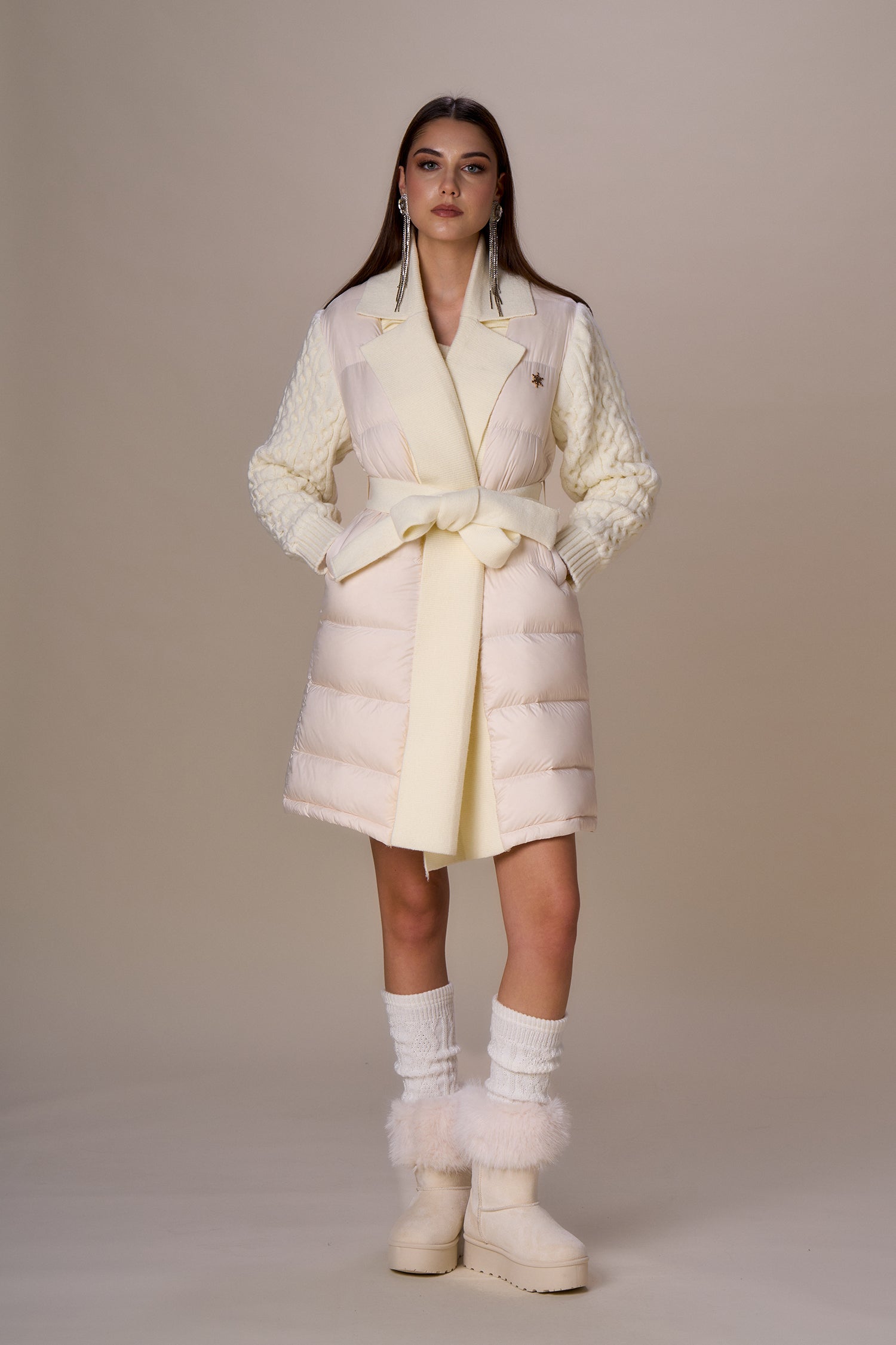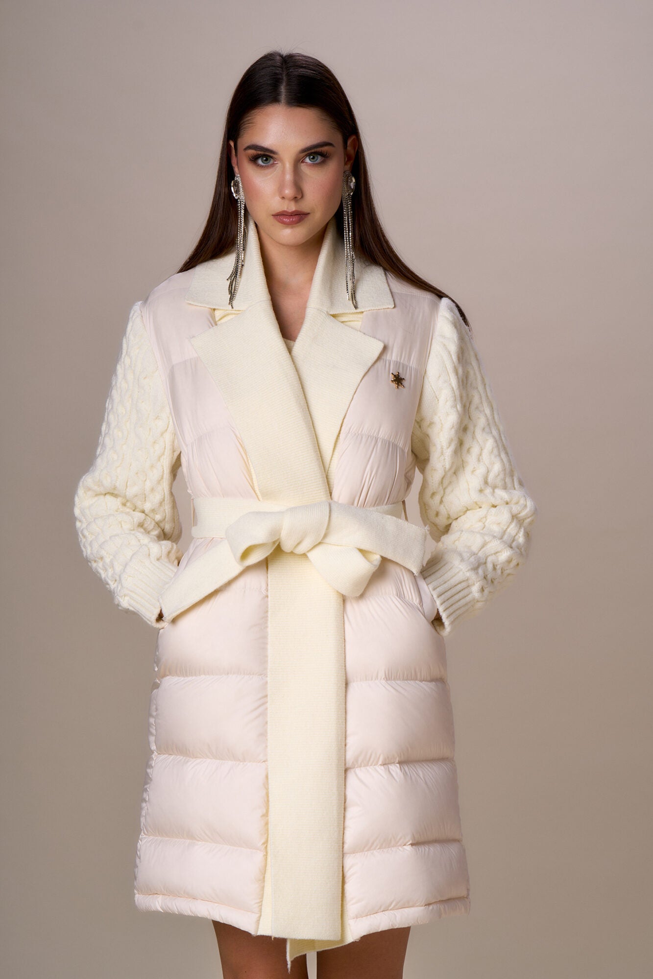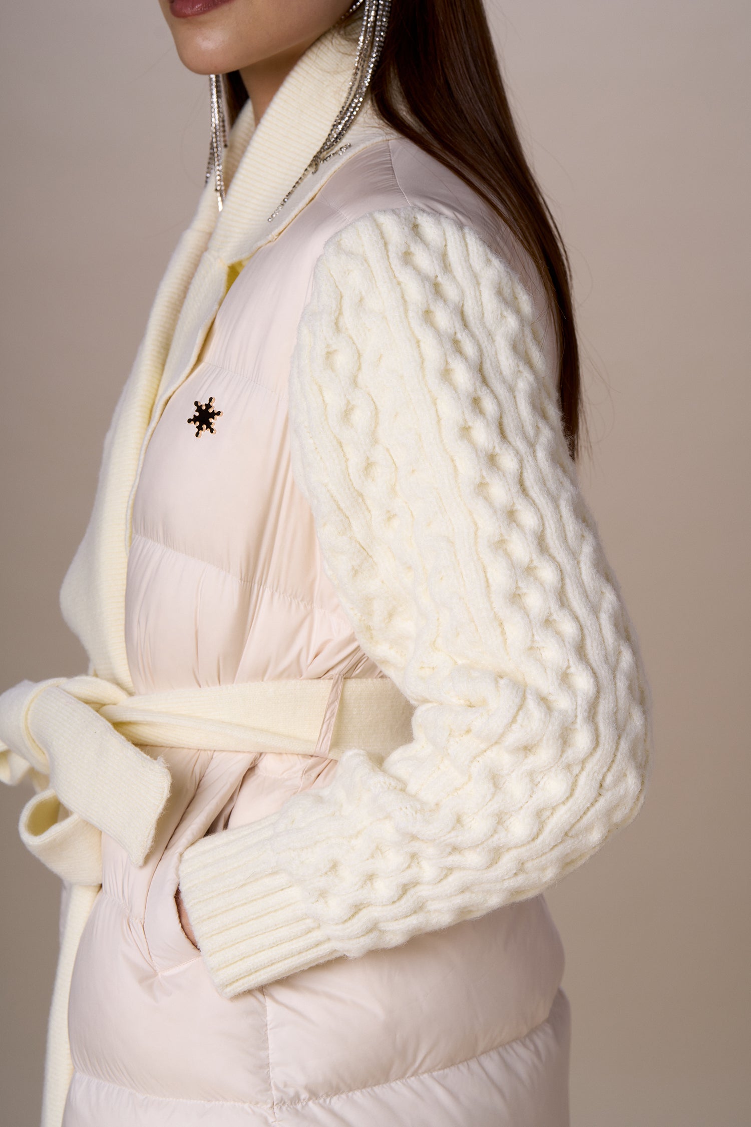 Piumino lungo con maniche in maglia a trecce, collo in maglia e chiusura con cintura in maglia.