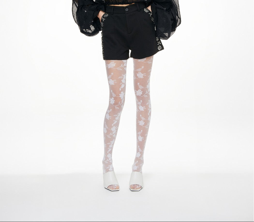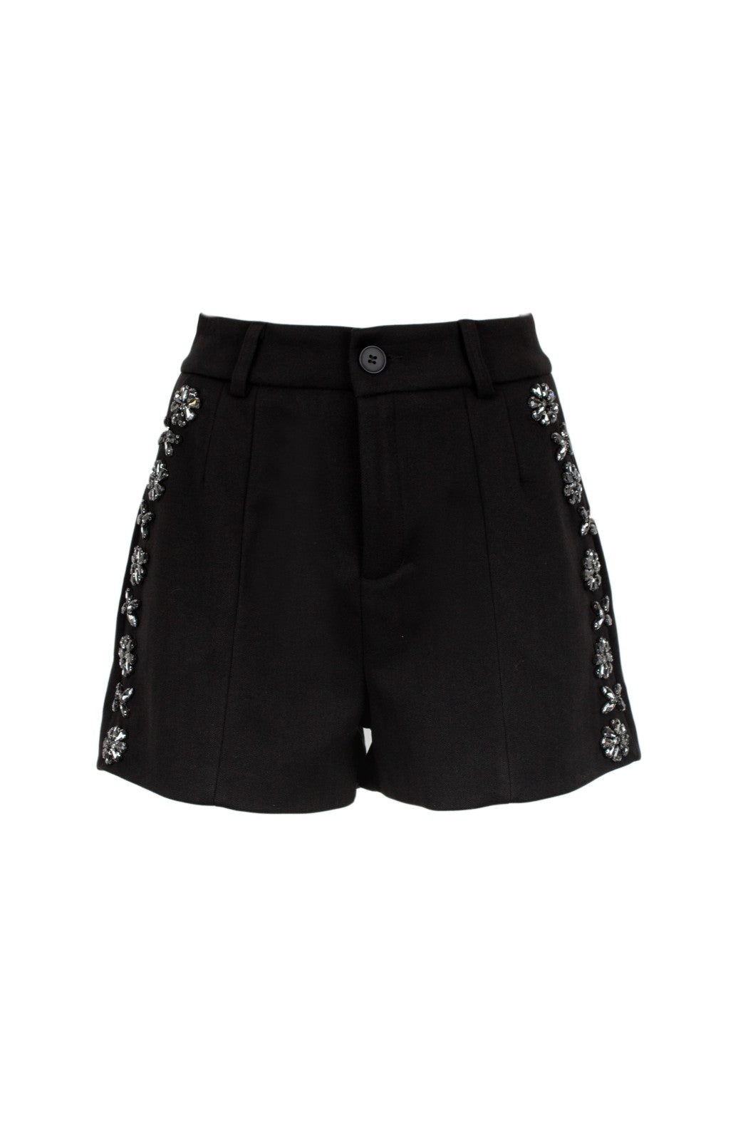 Shorts a vita alta. Il capo presenta delle applicazioni floreali gioiello lungo i fianchi.