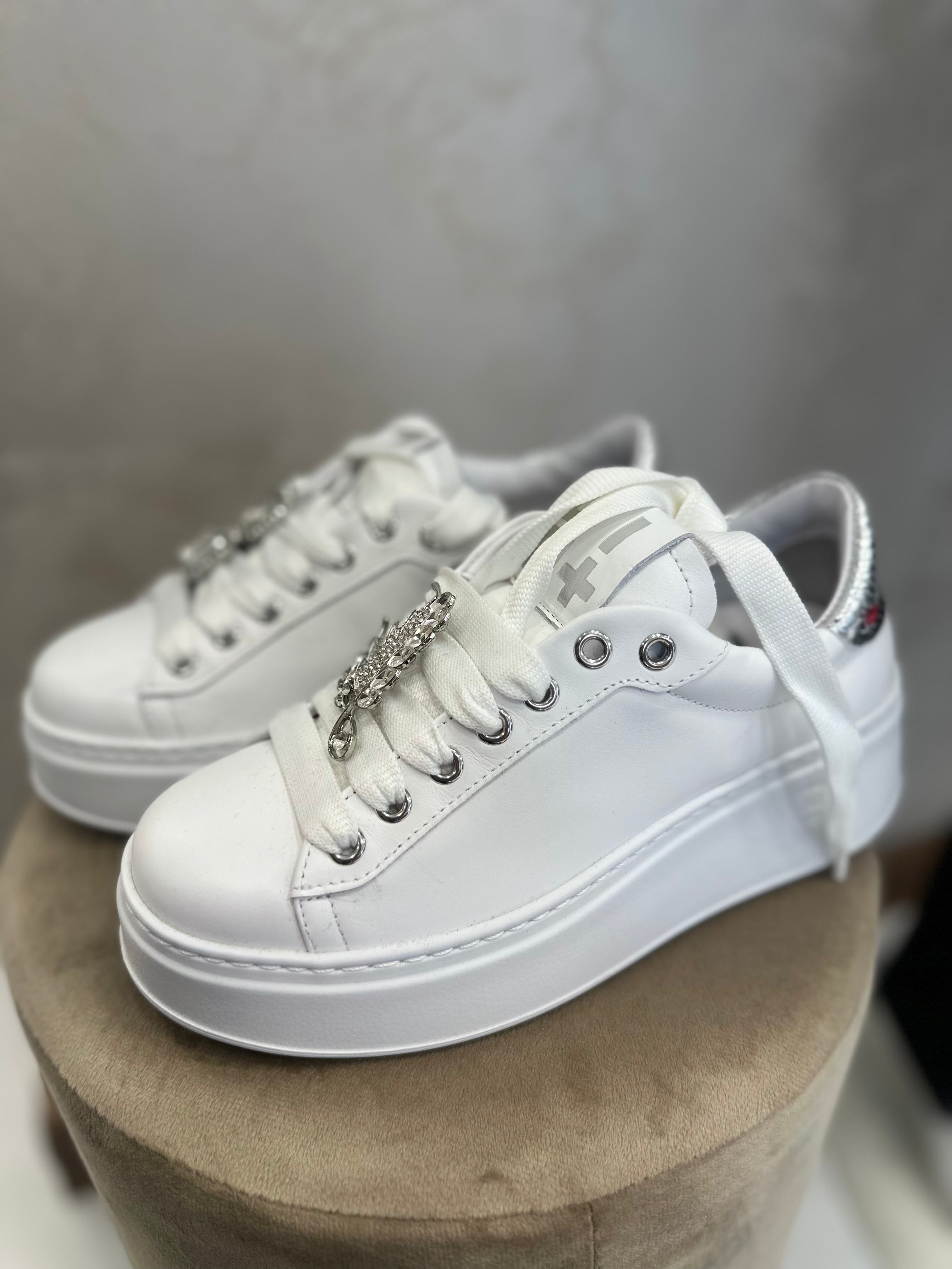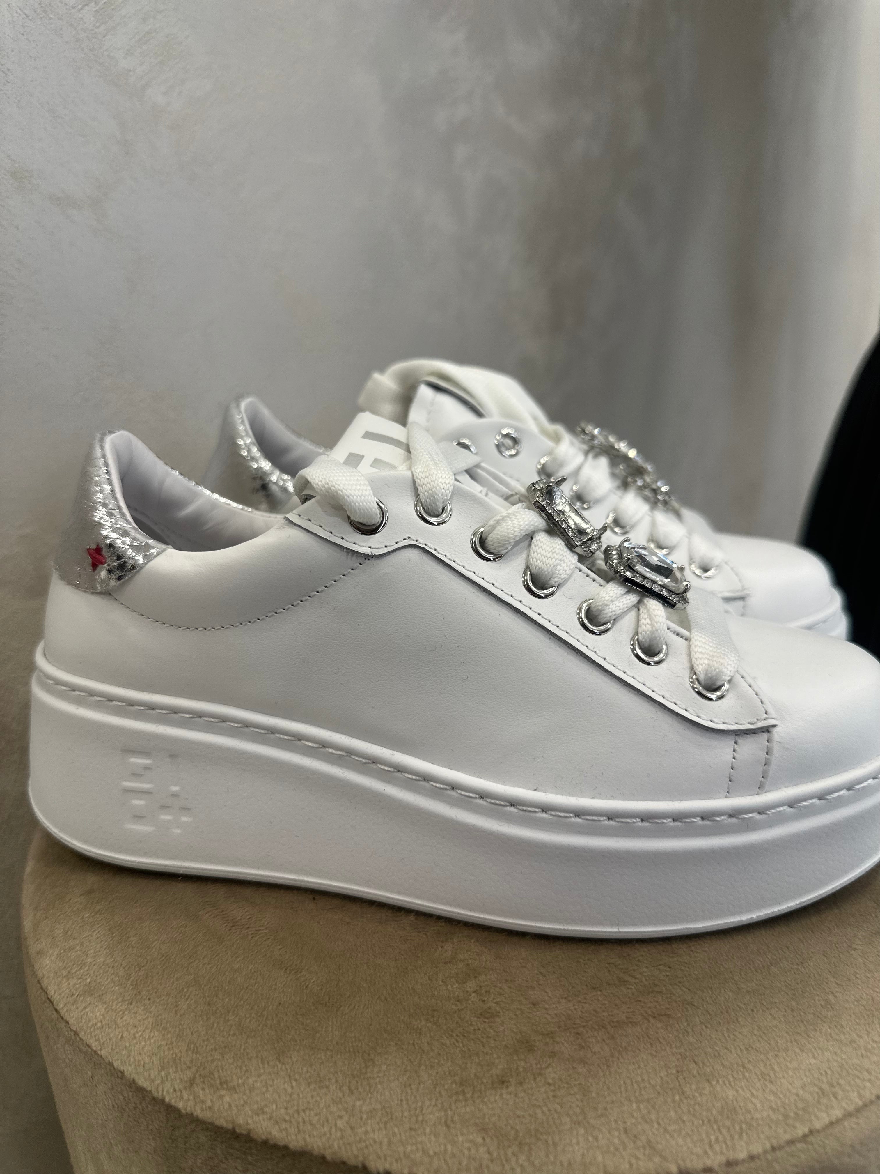 In pelle di vitello di colore bianco con talloncino in laminato argento.