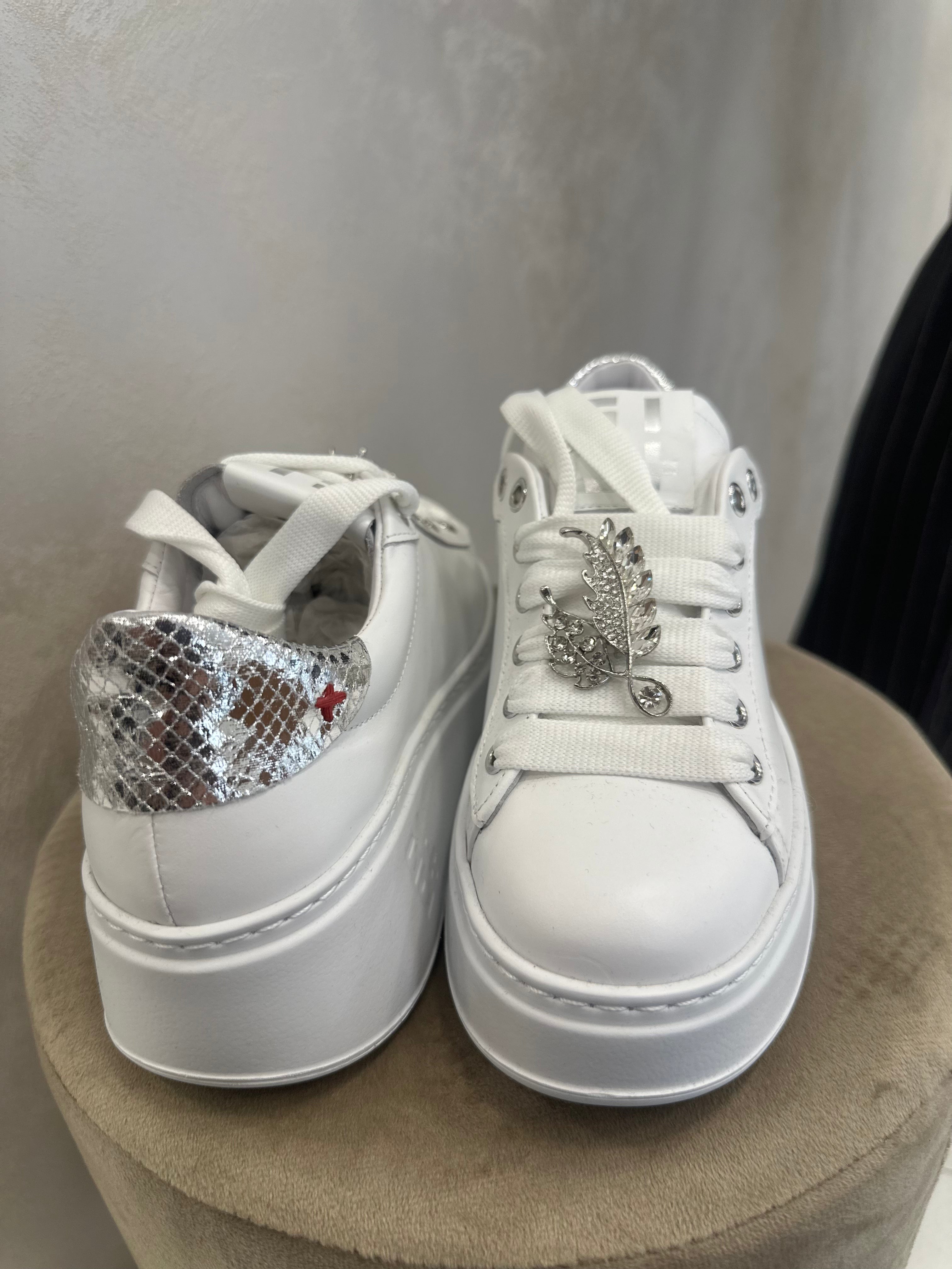 Caratterizzata da occhielli in metallo argento, targhetta sulla linguetta con il logo laminato, sono applicati accessori passalaccio a forma di piuma e castone, lacci piatti in cotone.