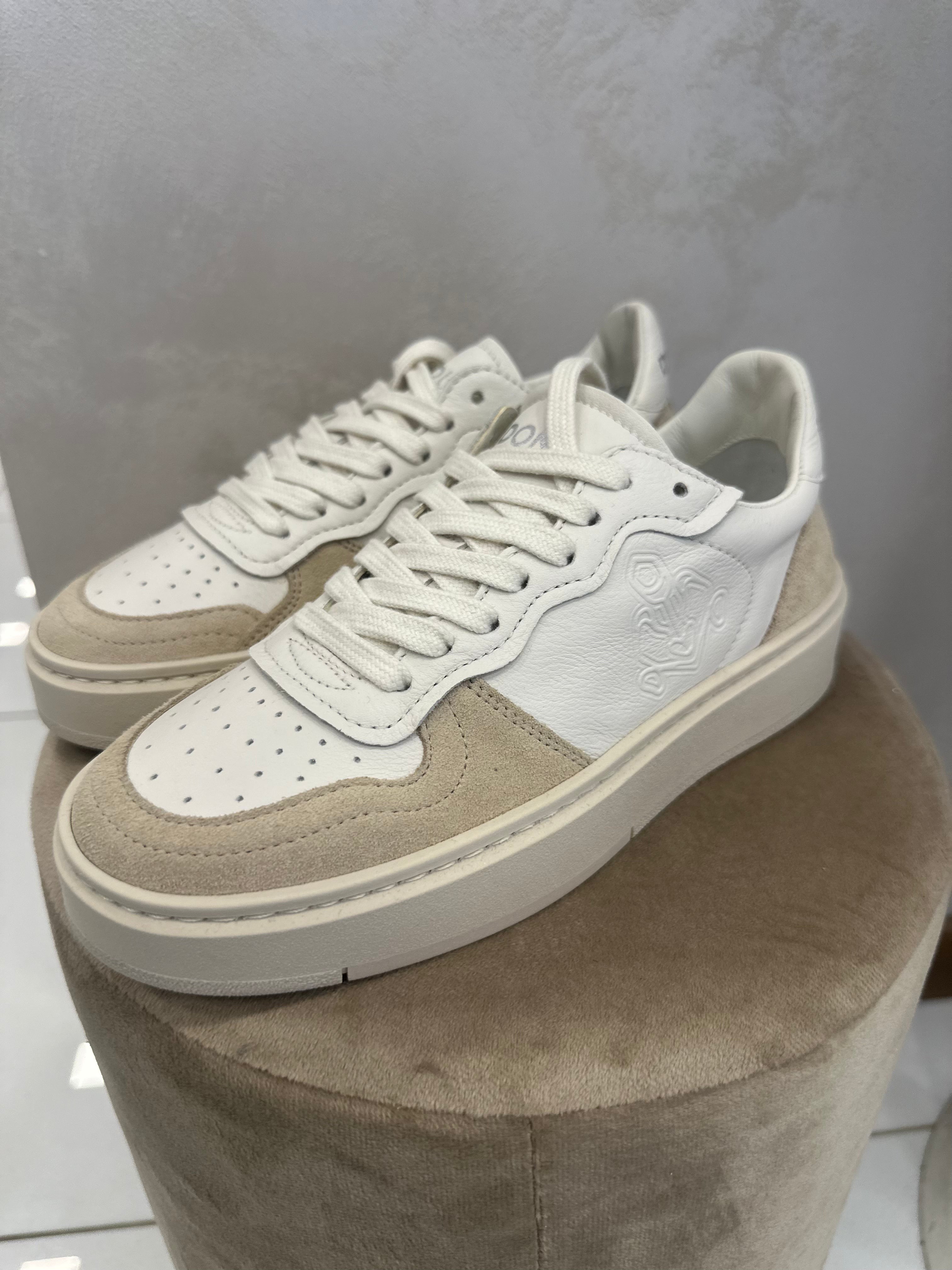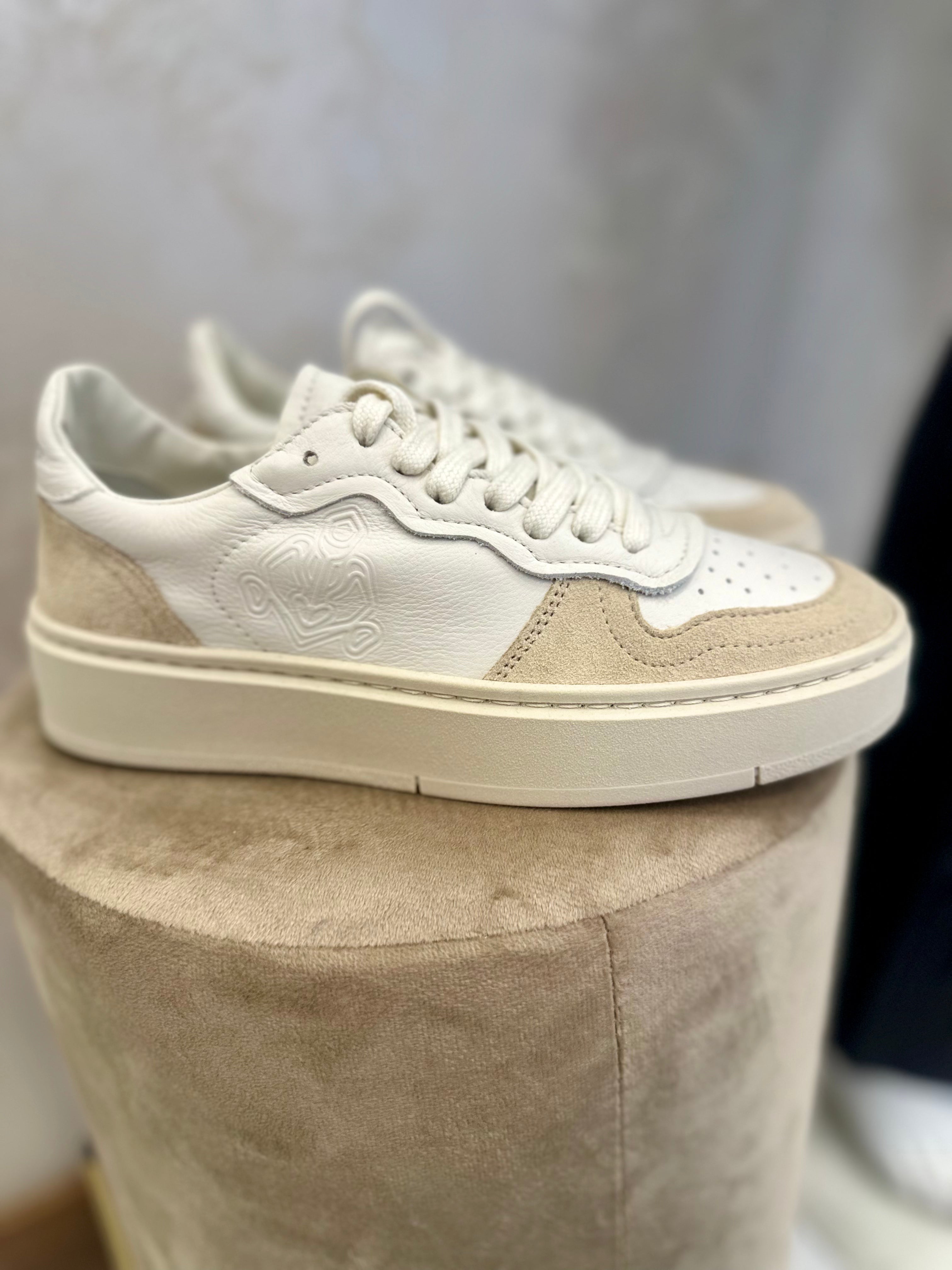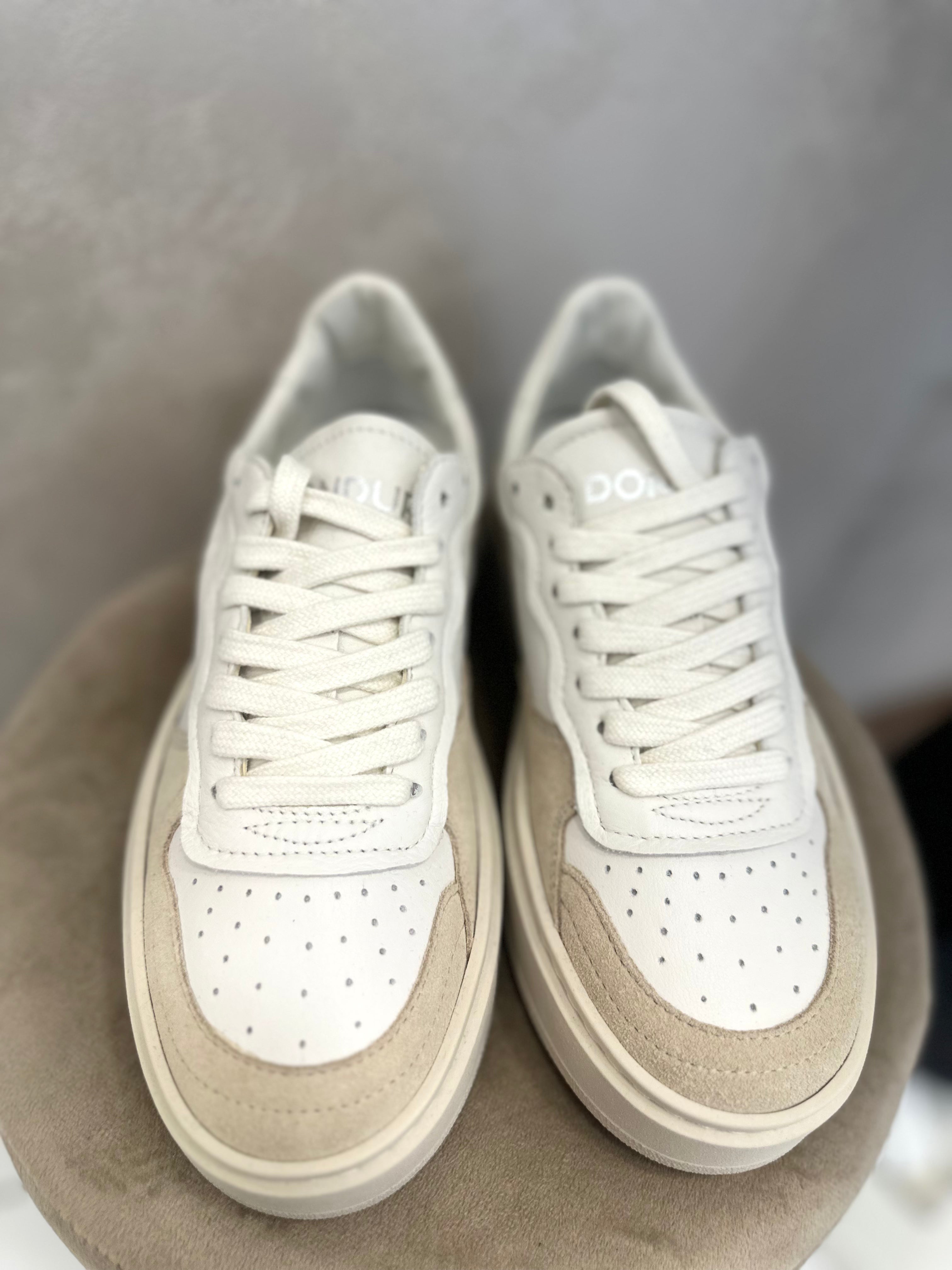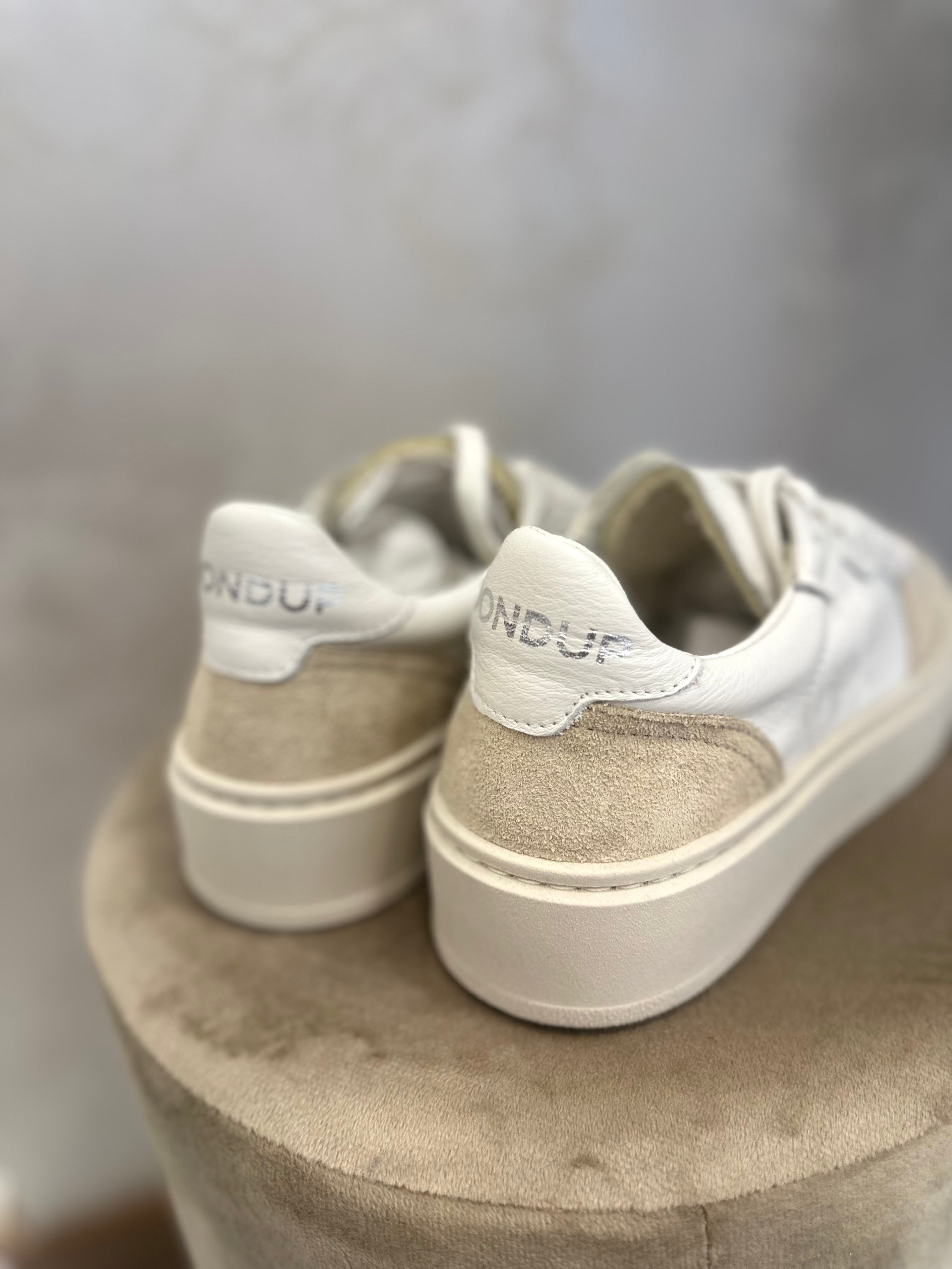 SNEAKERS BICOLOR CON LOGO ORO SU GONFIETTO POSTERIORE E SU LINGUETTA DAVANTI. PELLE E CAMOSCIO. LOGO DONDUP. MADE IN ITALY