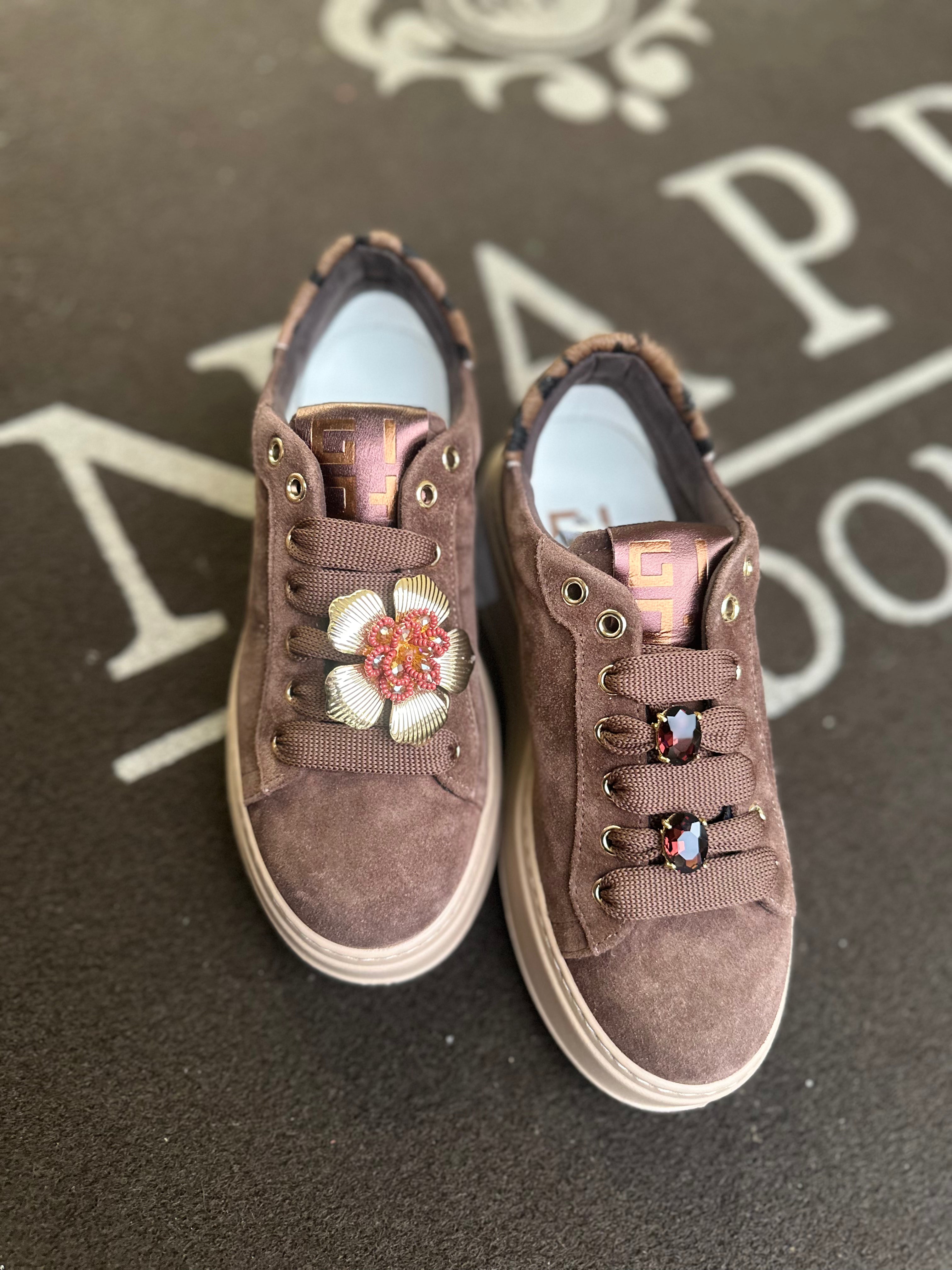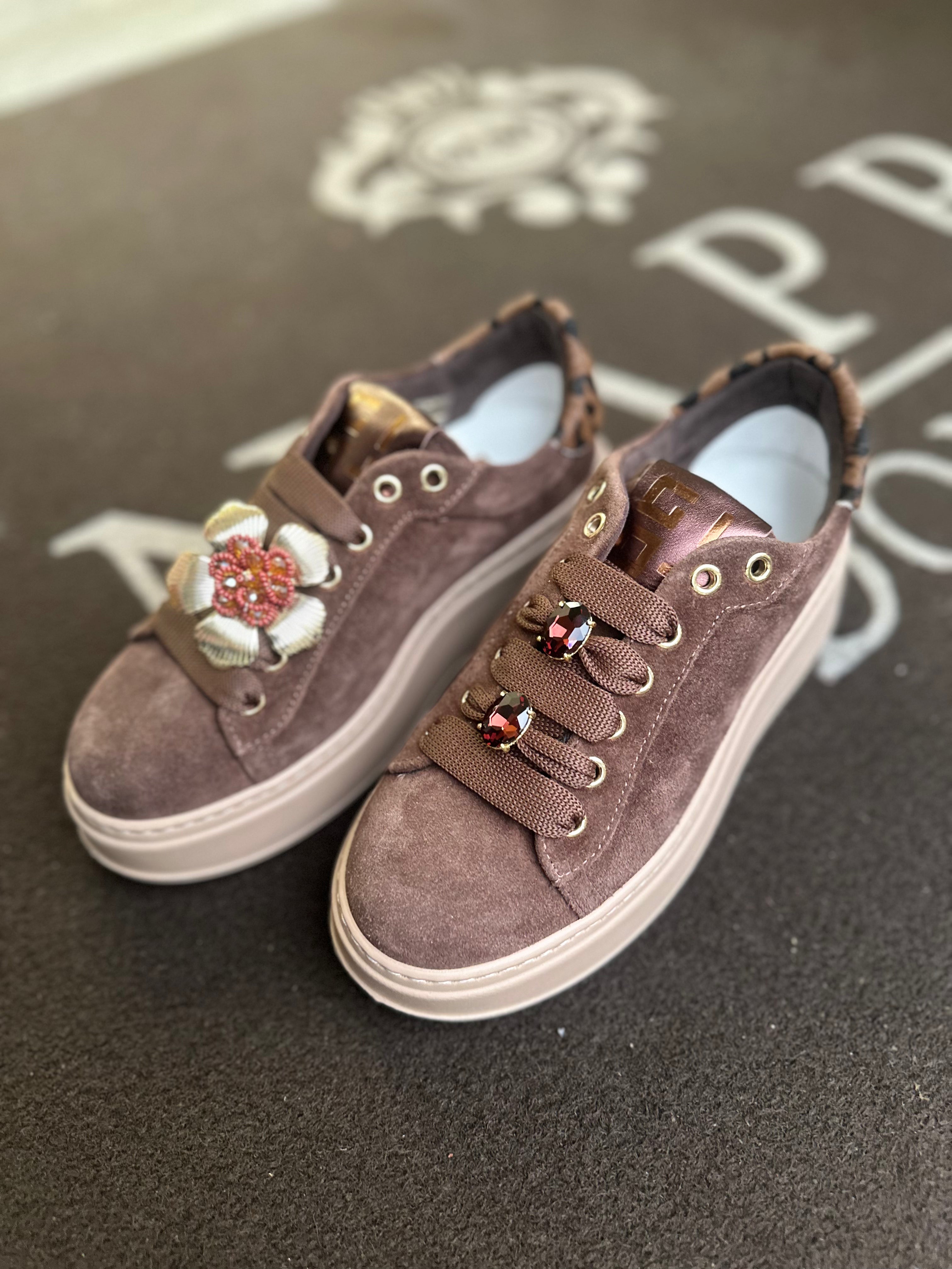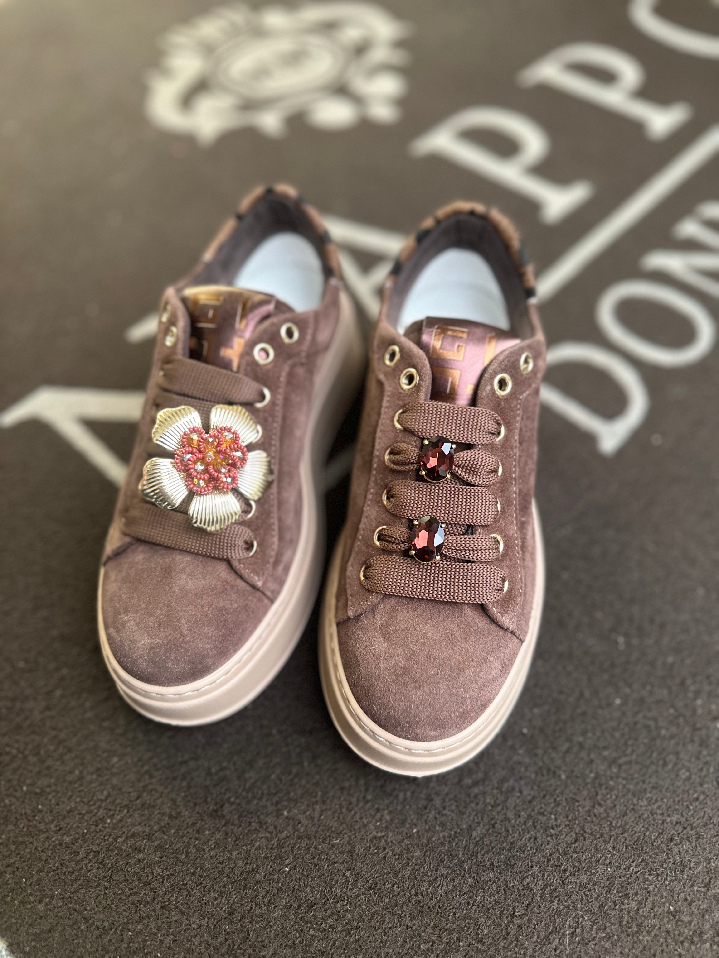 Sneakers in camoscio di colore marrone . Caratterizzata da occhielli in metallo oro, targhetta sulla linguetta con il logo in laminato oro e sono applicati accessori passalaccio a forma di fiore e castoni, lacci piatti in cotone.