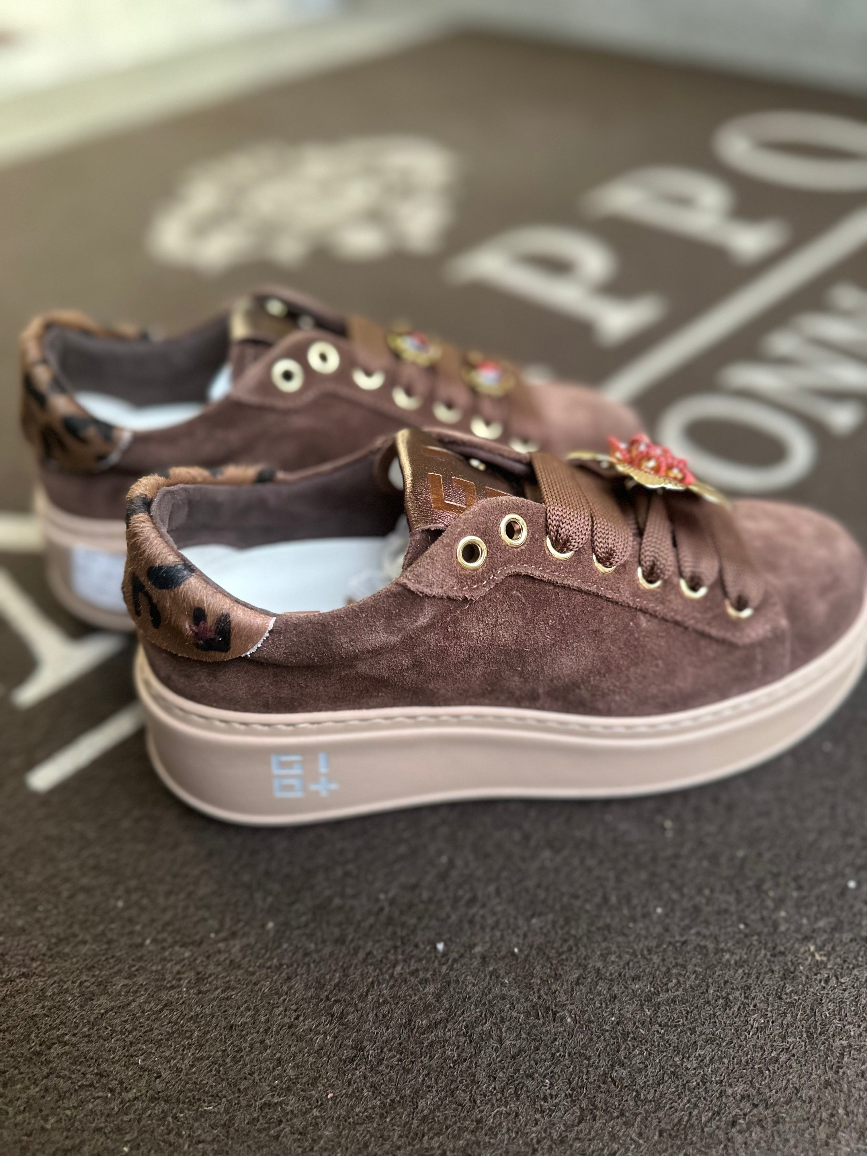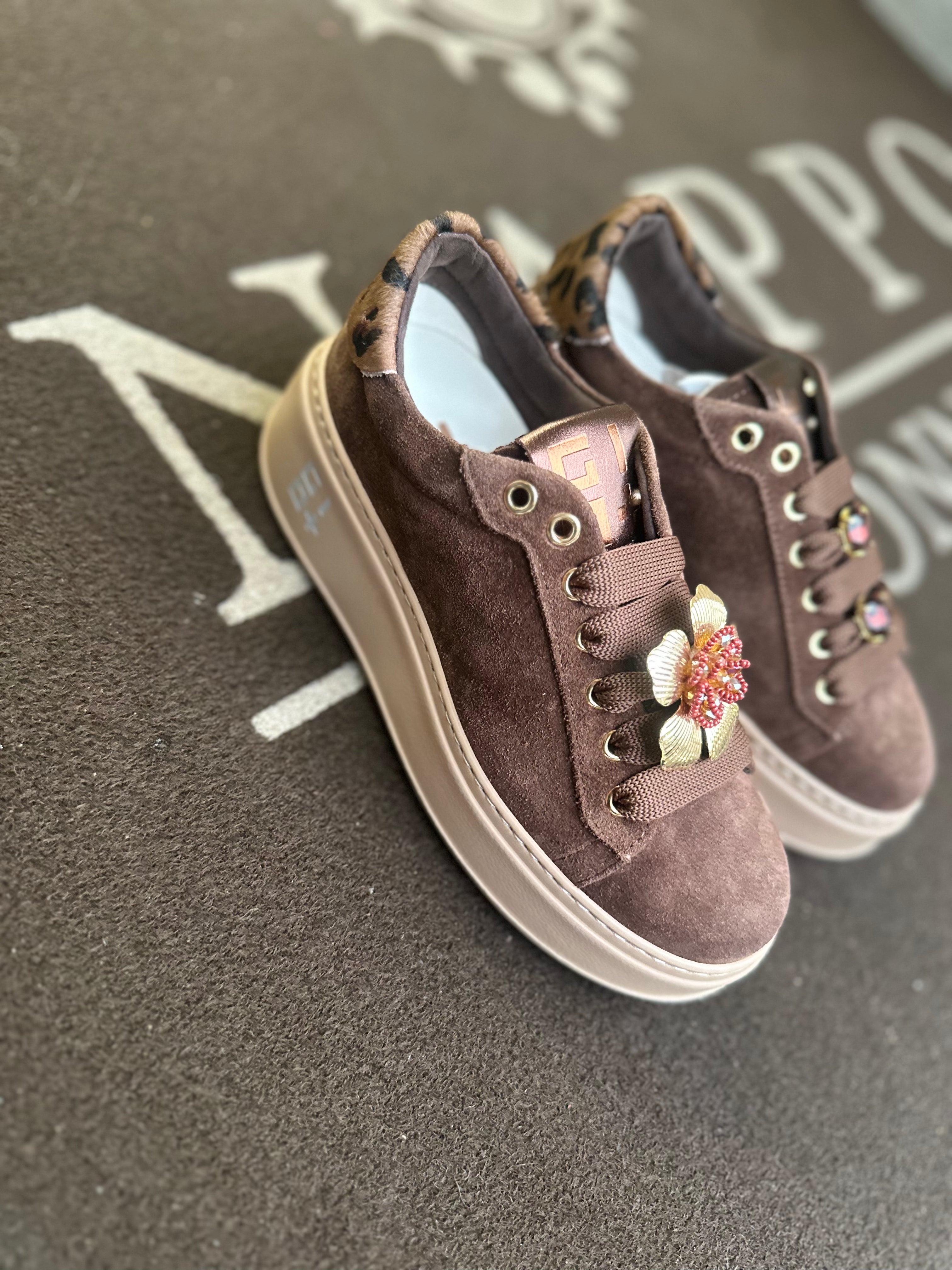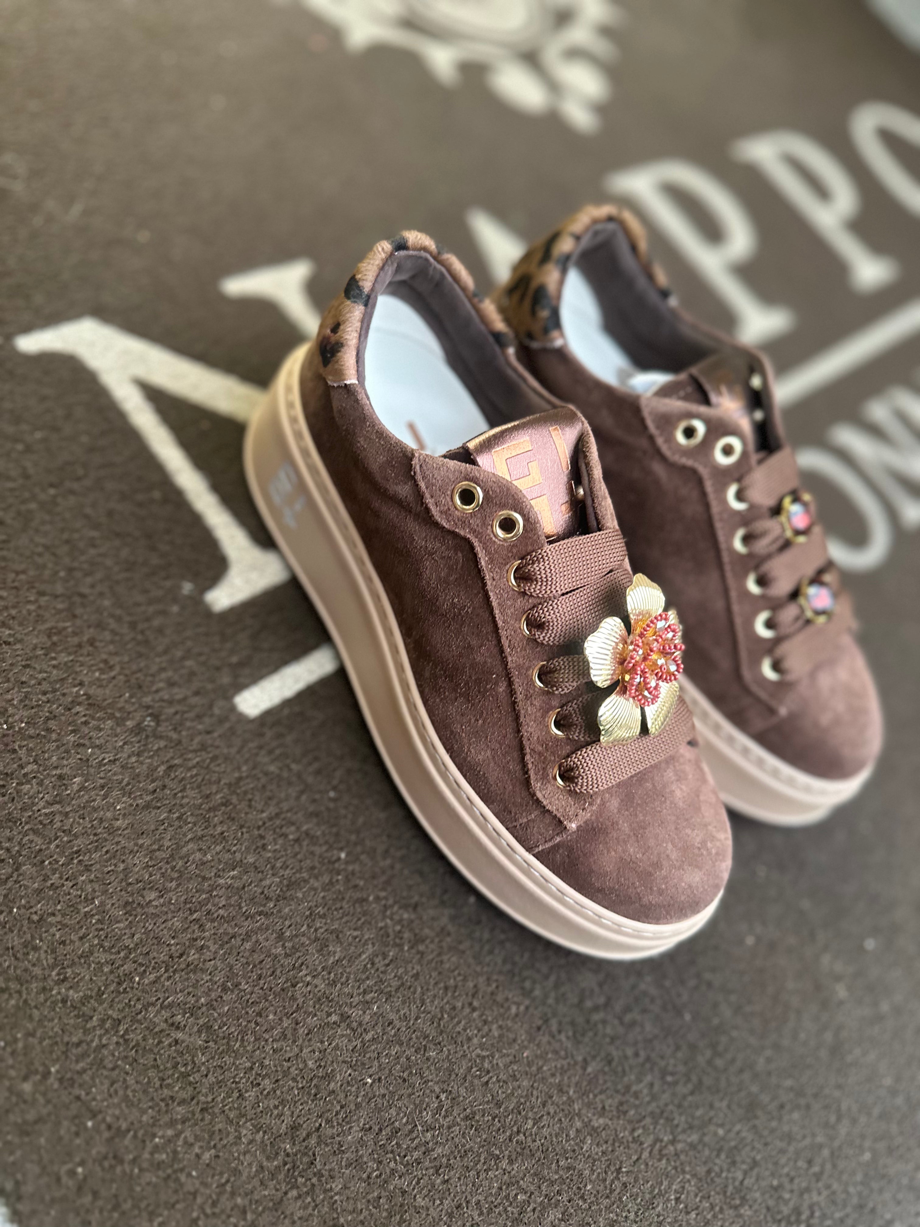 Sneakers in camoscio di colore marrone . Caratterizzata da occhielli in metallo oro, targhetta sulla linguetta con il logo in laminato oro e sono applicati accessori passalaccio a forma di fiore e castoni, lacci piatti in cotone.