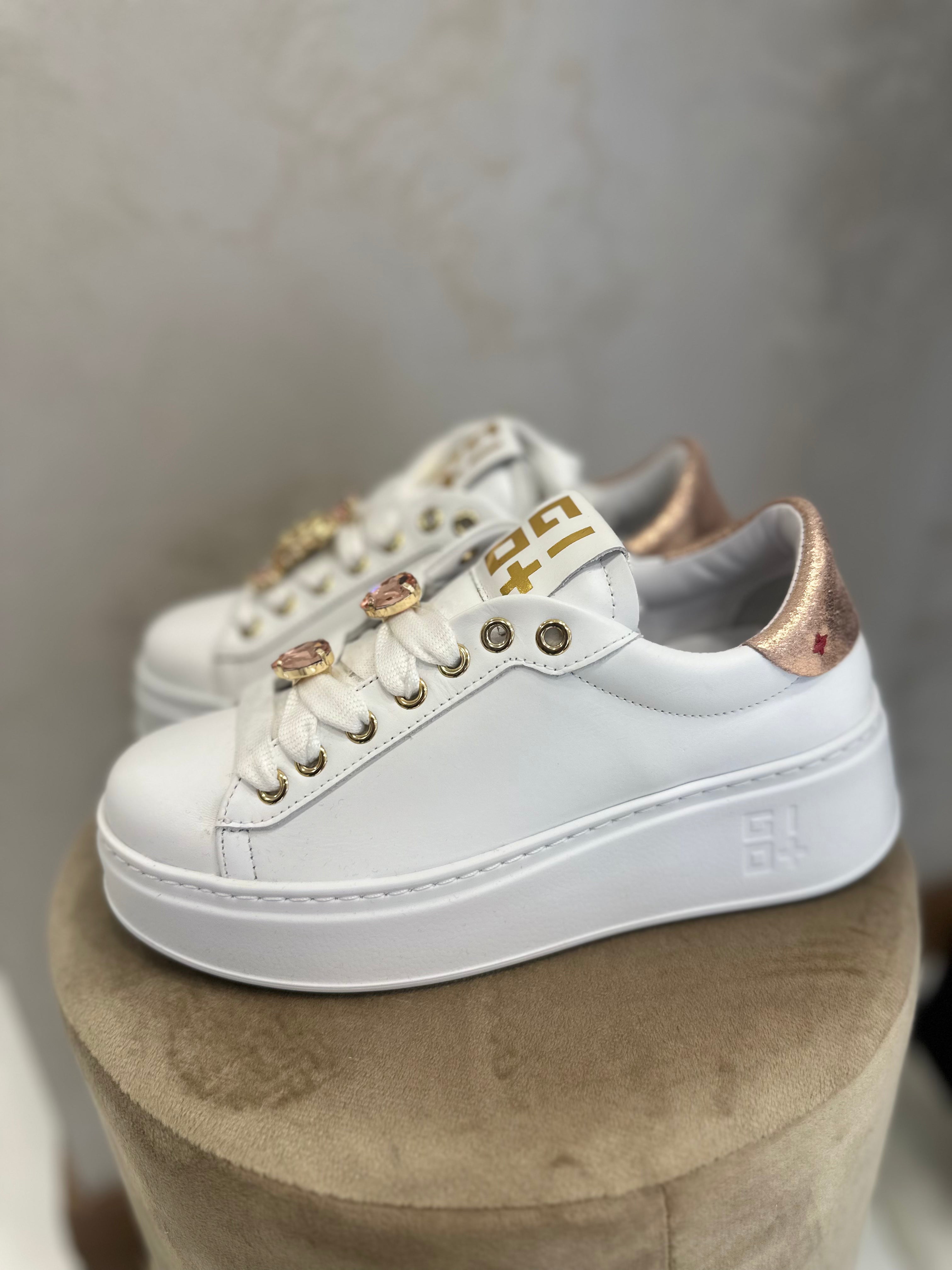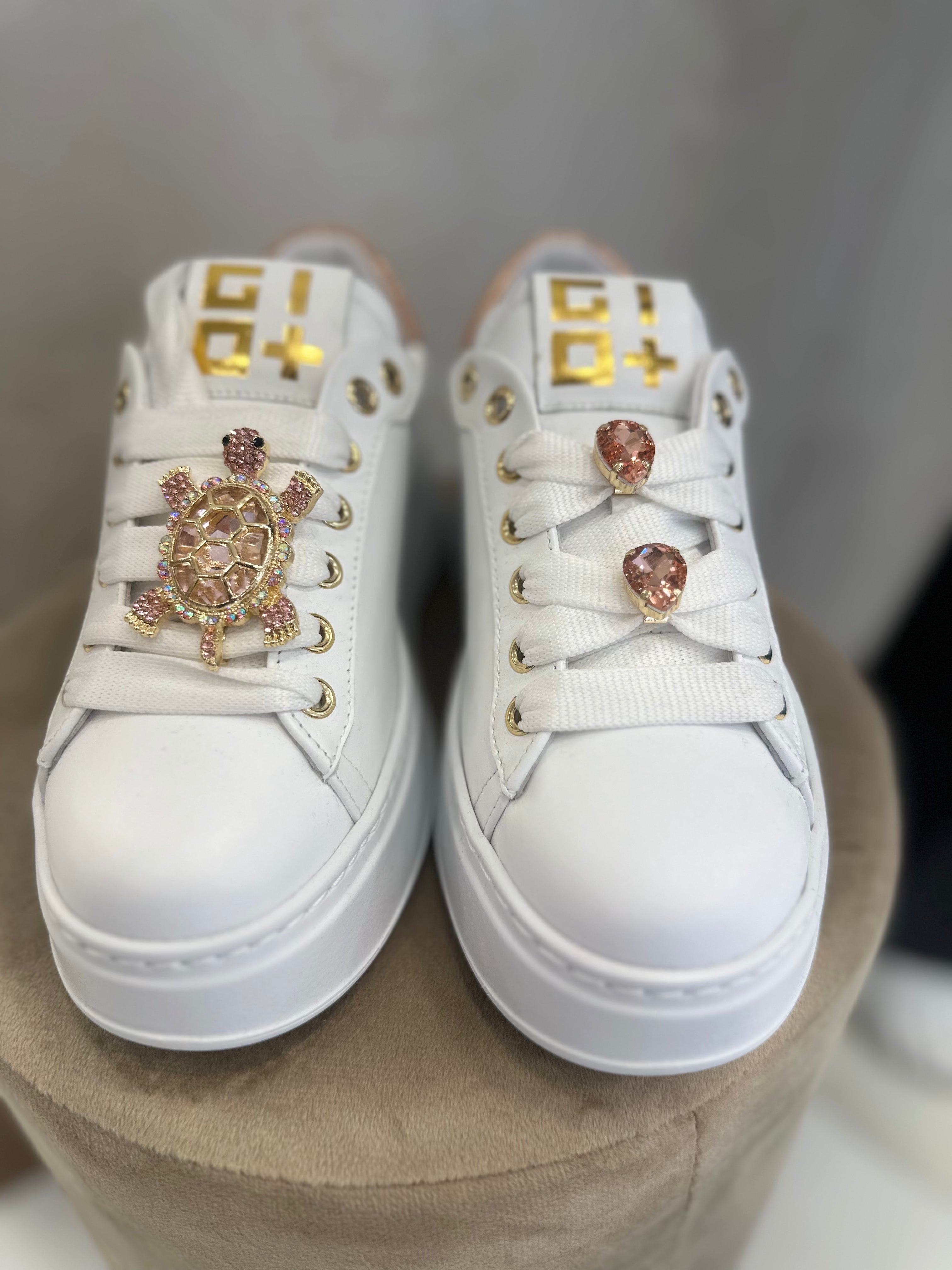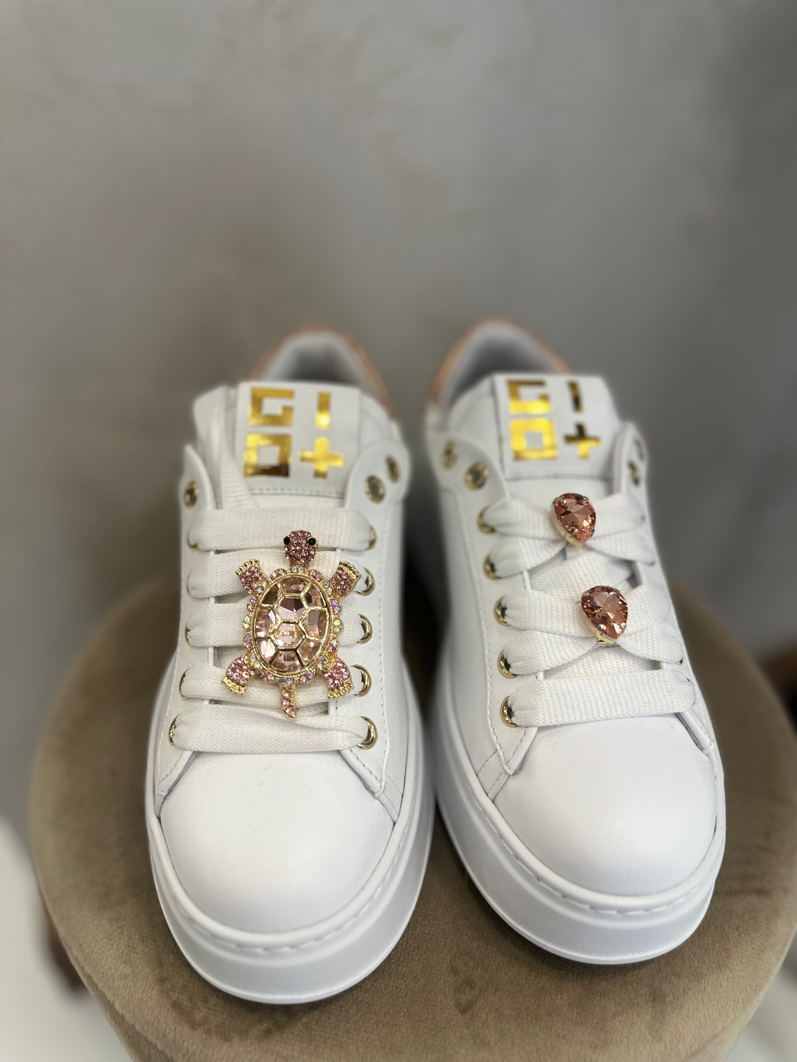 In pelle di vitello di colore bianco con talloncino in laminato rosa antico. Caratterizzata da occhielli in metallo oro, targhetta sulla linguetta con il logo in laminato oro e sono applicati accessori passalaccio a forma di tartaruga e castone, lacci piatti in cotone.